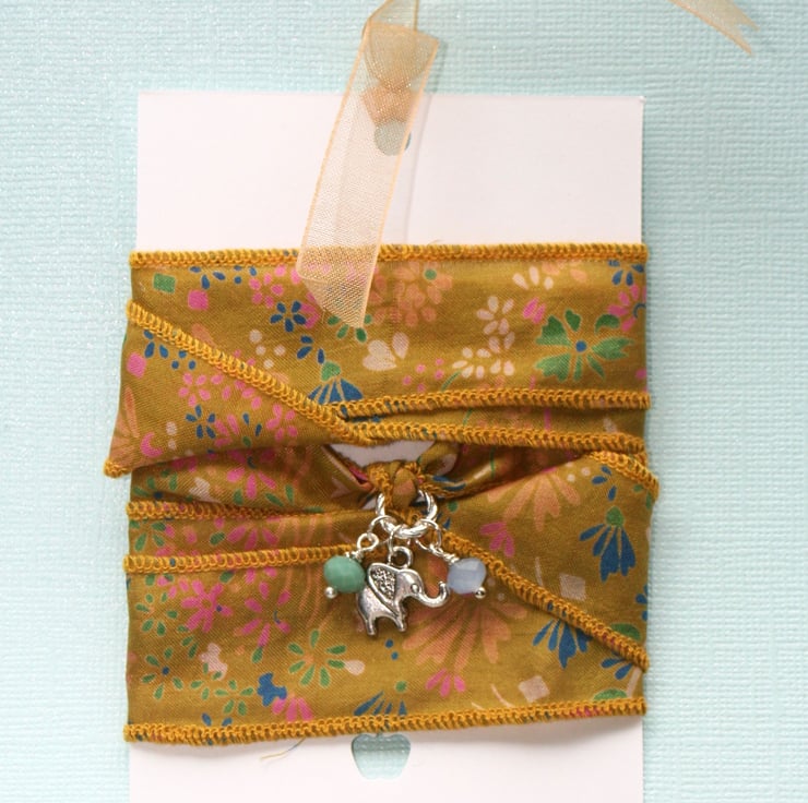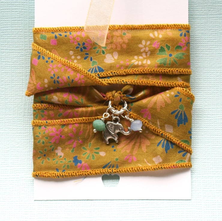 A beautiful soft patterned silk ribbon wrap bracelet in mustard yellow, pink, green and blue finished with complementing colours of faceted Czech glass and a cute elephant charm.