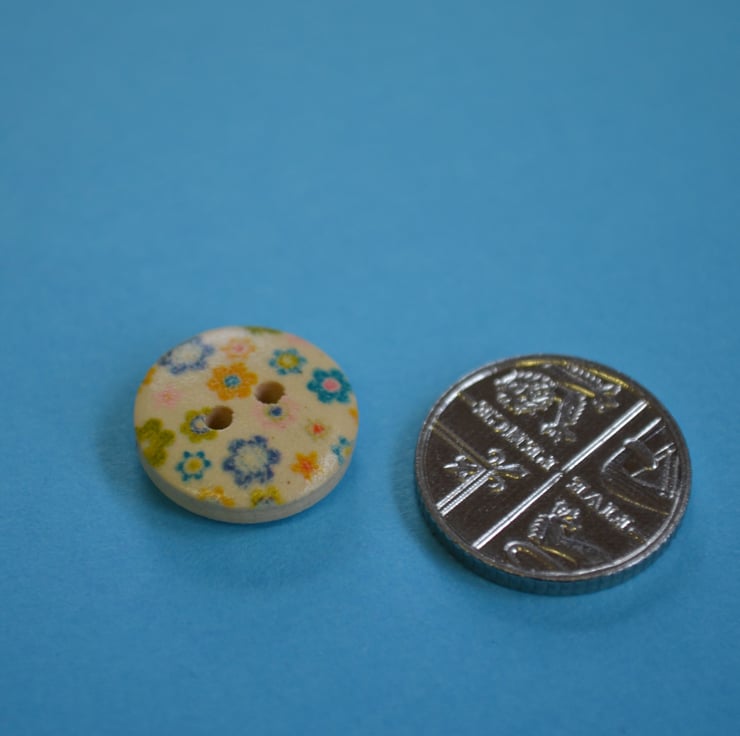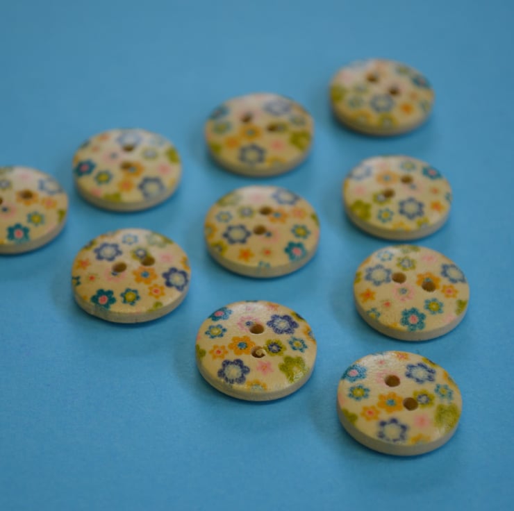 15mm Wooden Blue Green Yellow Floral Buttons Natural Wood 10pk Flowers (SNF4)