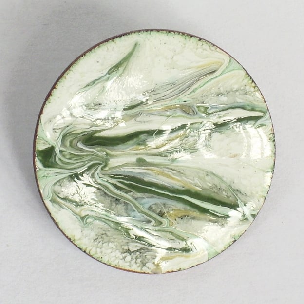 I made the brooch by drawing a steel tip through small pools of dark green enamel I had sprinkled on a base of several layers of white enamel built up on the copper disc, while the piece was at red hot in the kiln. This created the unique, random pattern.