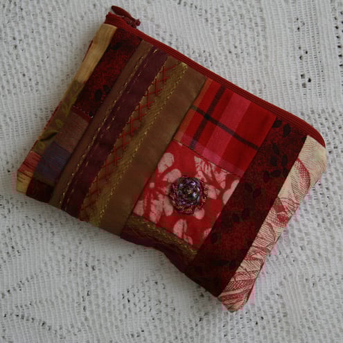 Strip patchwork has been embellished with hand-embroidery on this red and gold purse. It may be used for cards, cash, small gadgets or other personal items.
