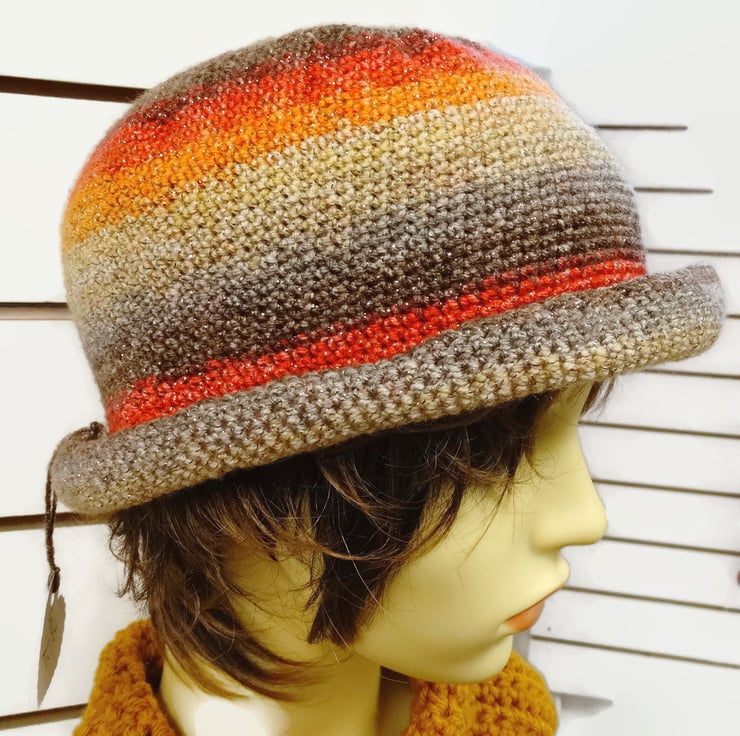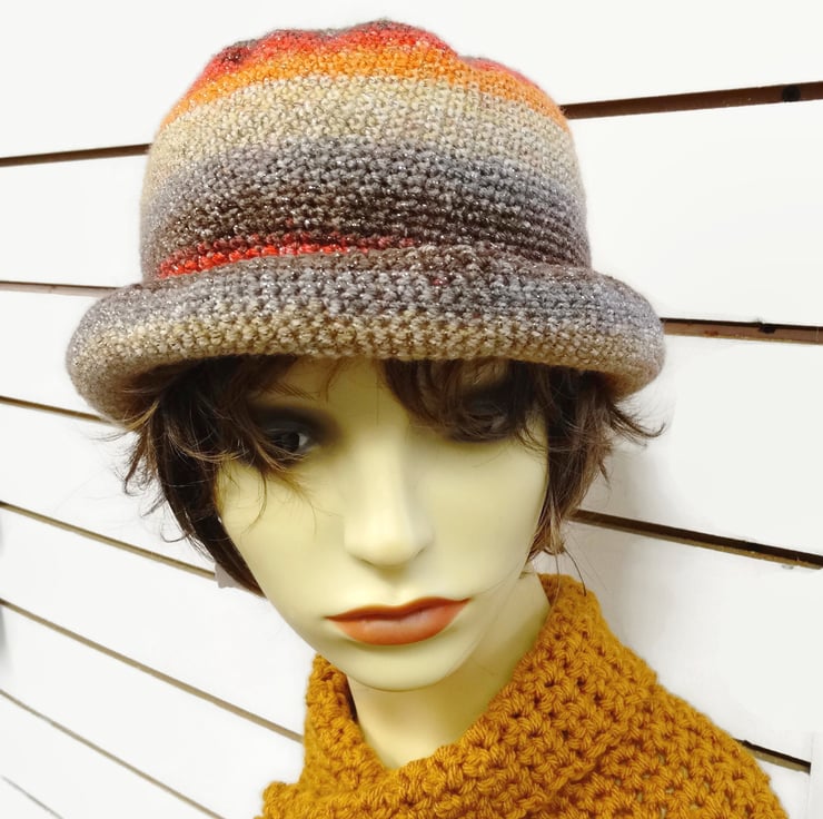 Gorgeous self striping yarn used to make this comfortable hat for winter and summer.