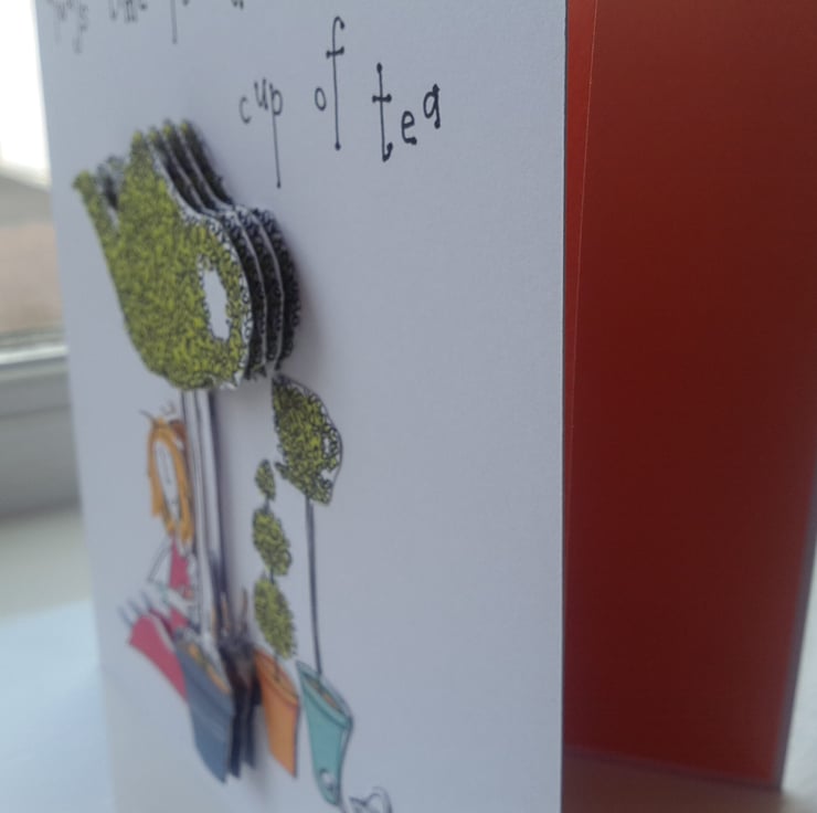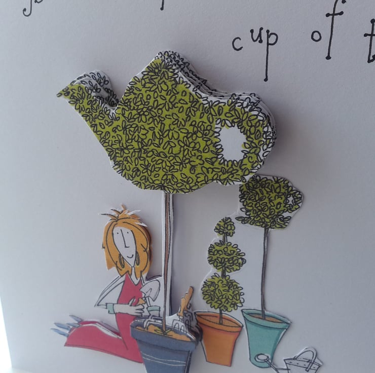 A completely handmade and uniquely designed card. Consisting of a topiary tea