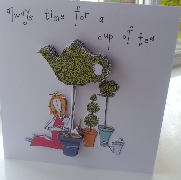 Ot decoupaged, with a lady gardener tending to it. Mounted onto pristine white quality card. The words always time for a cup of tea handwritten in black ink