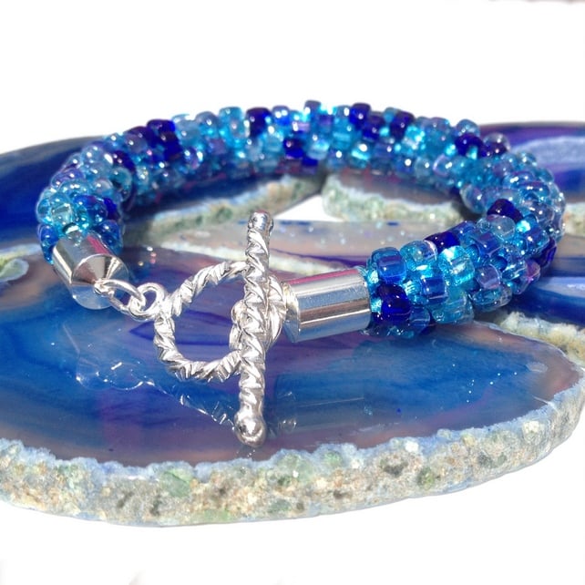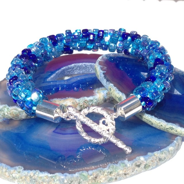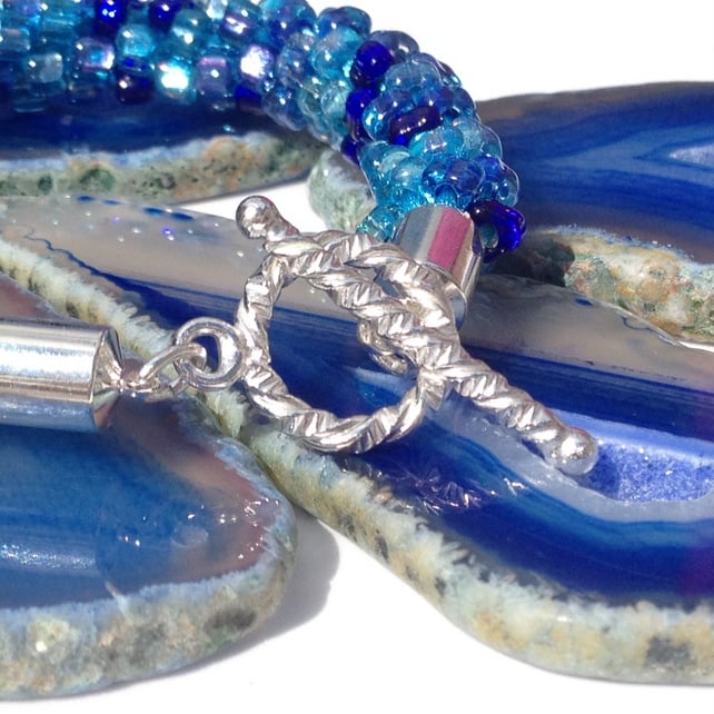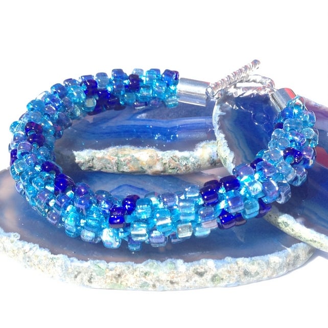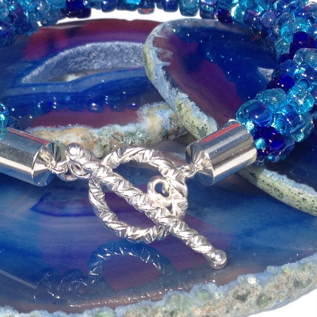 A mixture of different shades of blue size 5 miyuki seed beads, slightly triangular in their shape, have been threaded onto 8 strands of 1mm blue satin cord, that have then been brought together using the above technique.