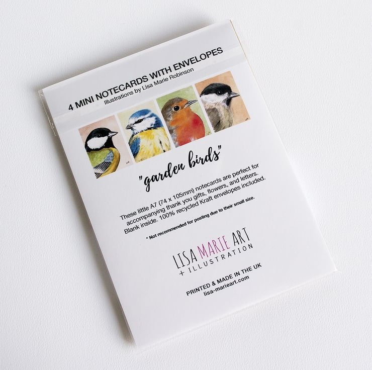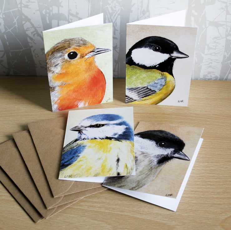 These little garden bird note cards are perfect for accompanying thank you gifts, flowers, and letters. Each one features an illustration of a different UK garden bird painted by myself - Blue tit, Robin, Great Tit, Marsh Tit.