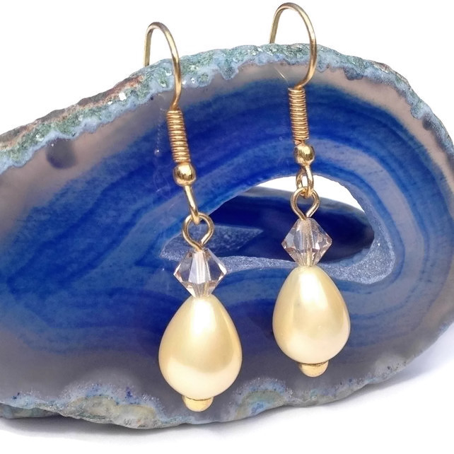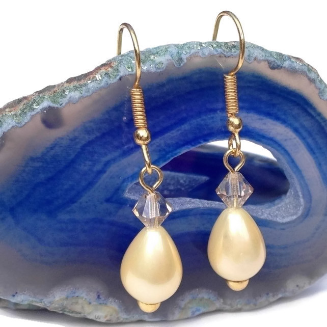They have been created using a 13x10mm golden yellow shell pearl drop as the focal point. A 6mm champagne coloured crystal has been added to create a bit of sparkle.