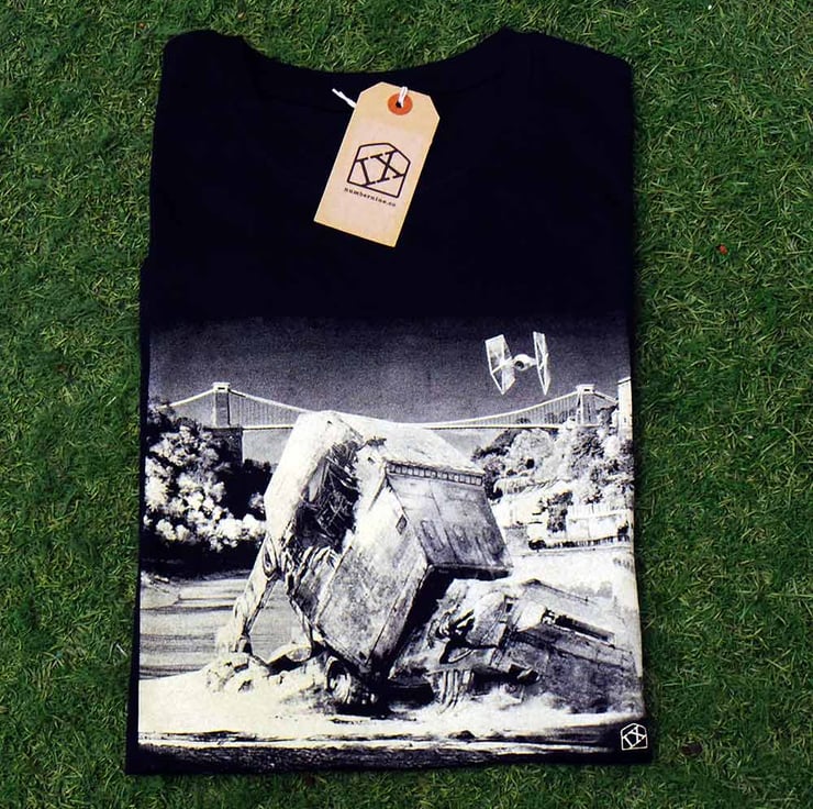 "After a fierce dog fight with the Millennium Falcon and a vicious ground assault along the Avon Gorge, a TIE Fighter surveys the aftermath and finds a downed AT-AT Walker against the backdrop of Bristol’s Clifton Suspension Bridge."