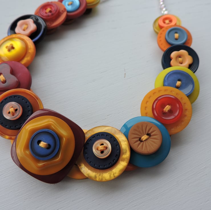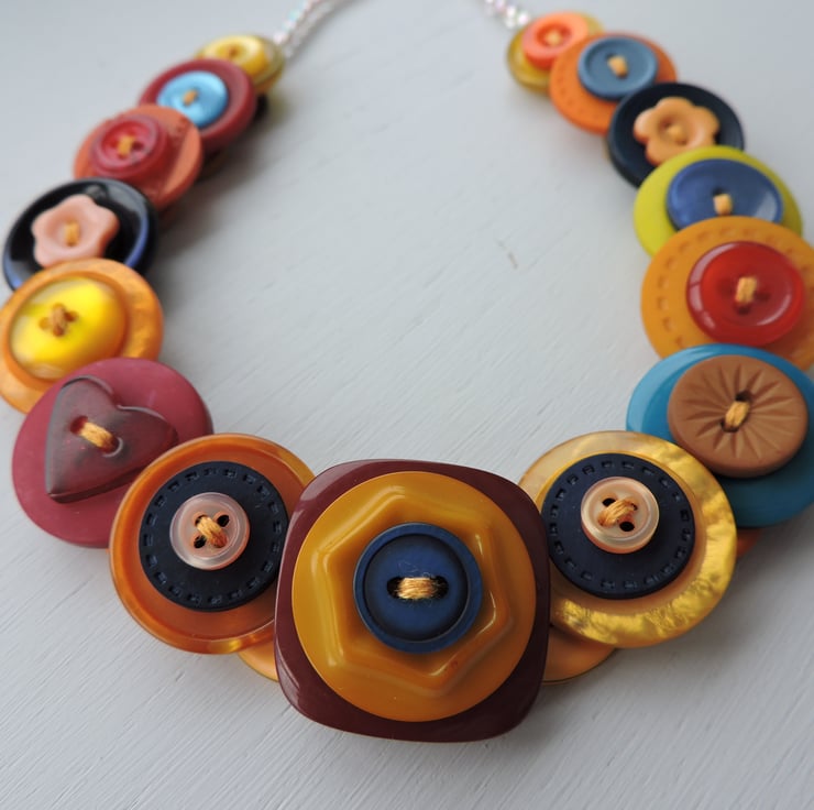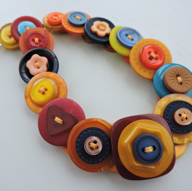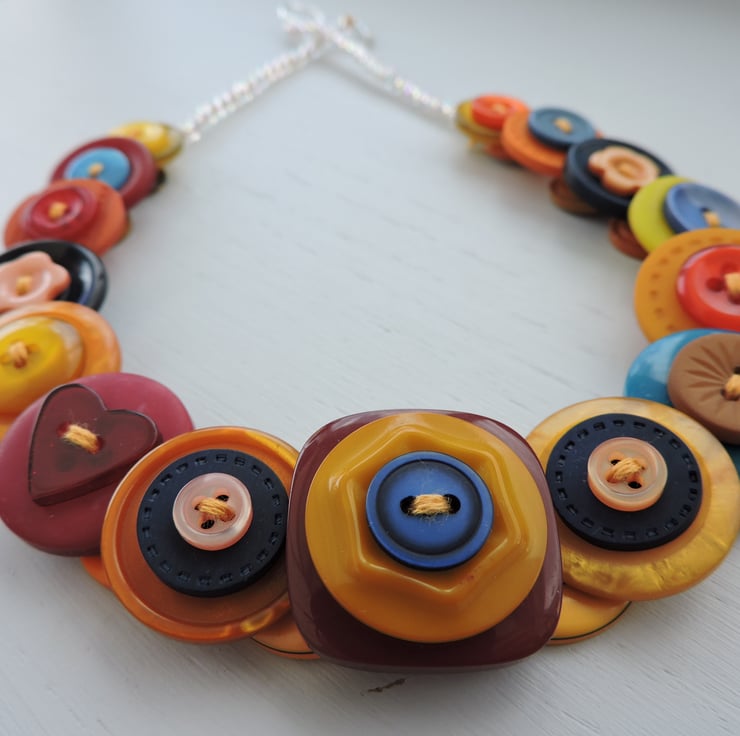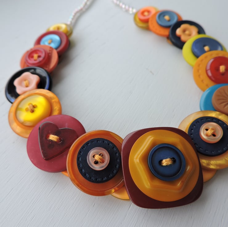 This colourful button necklace is made by layering and stacking an assortment of orange, yellow, red and blue buttons which have been threaded and knotted with 6 strands of embroidery thread and finished with little clear Aurora Borealis beads and a silver plated toggle clasp