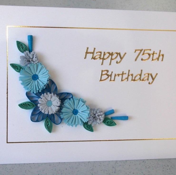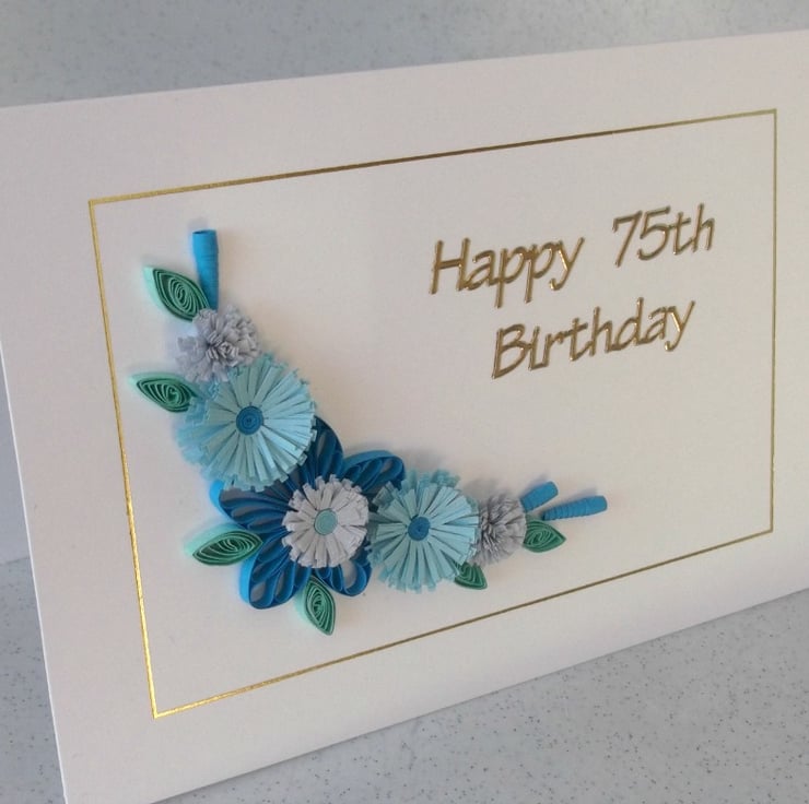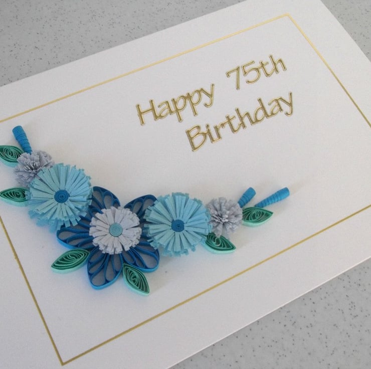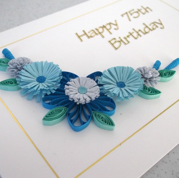 A beautiful quilled birthday card with quilling flowers in shades of blue, perfect for sending special birthday wishes. I can personalise the message especially for you, for any special birthday - just let me know as you check out.
