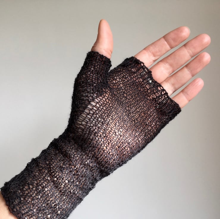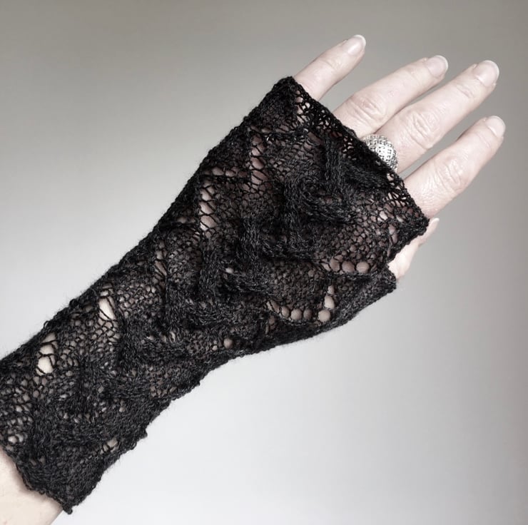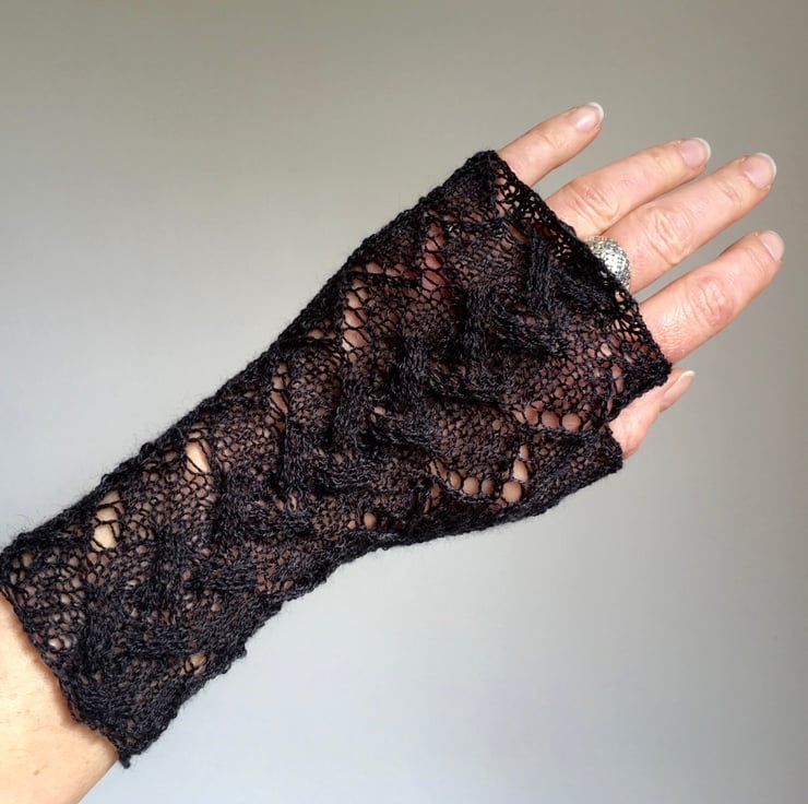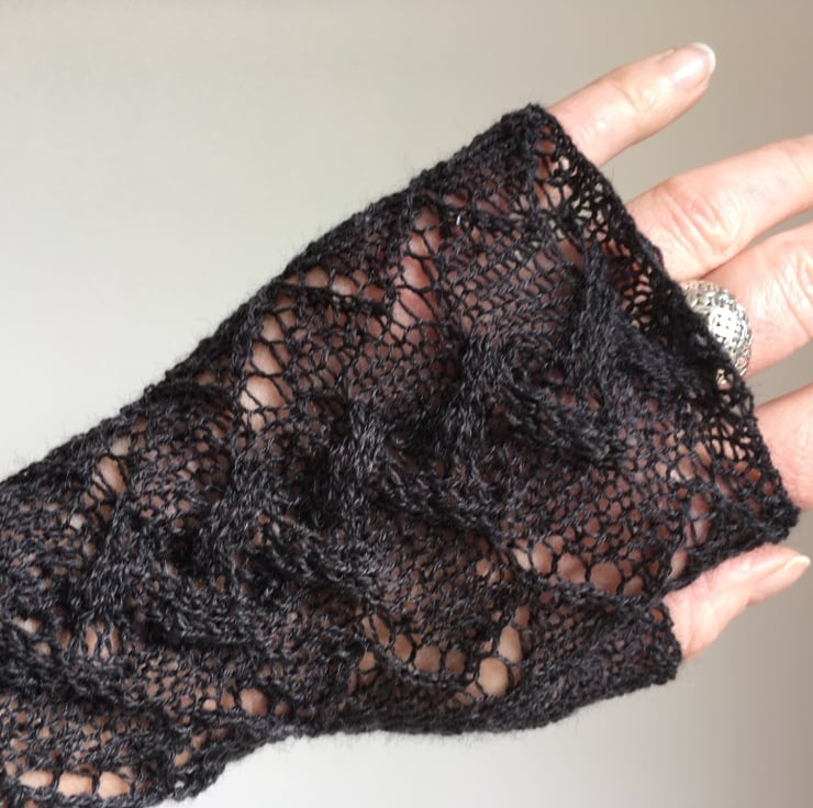 A soft delicate pair of fingerless gloves knitted in a lovely lacy pattern