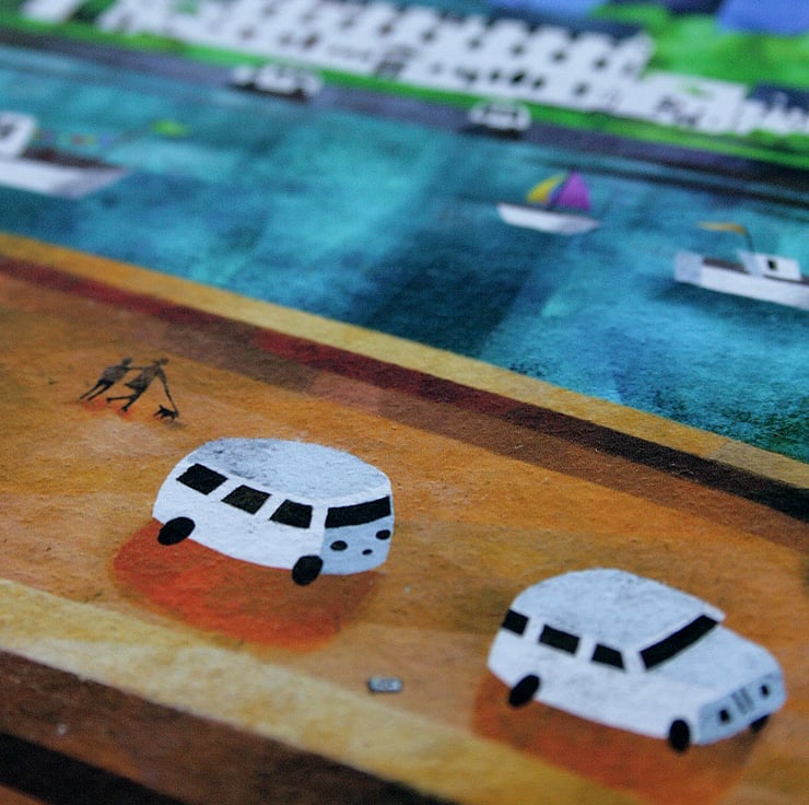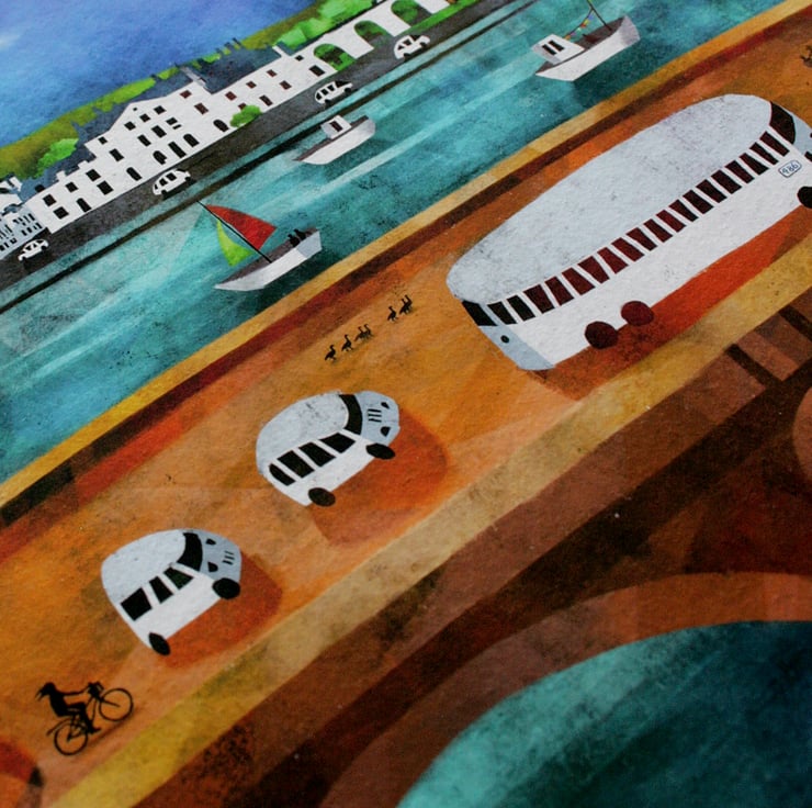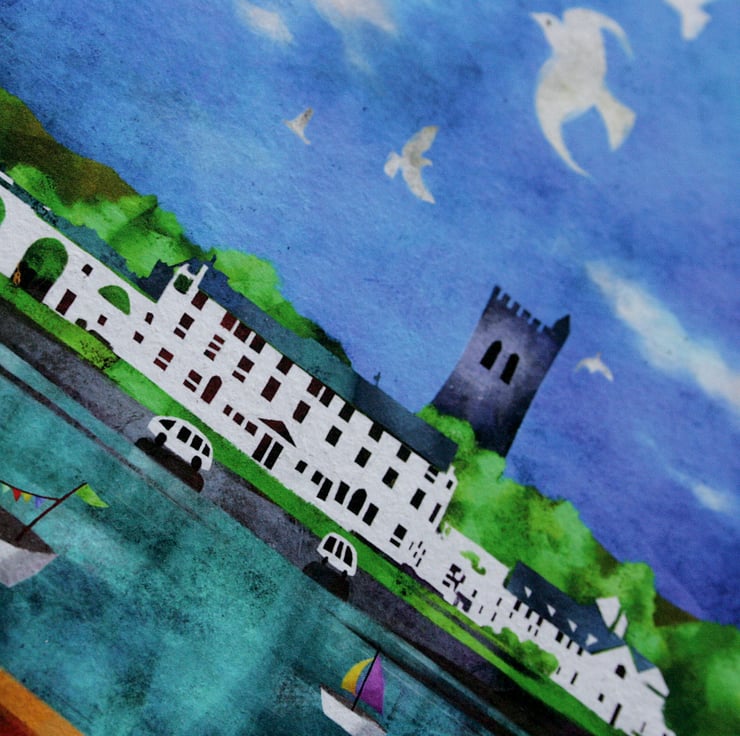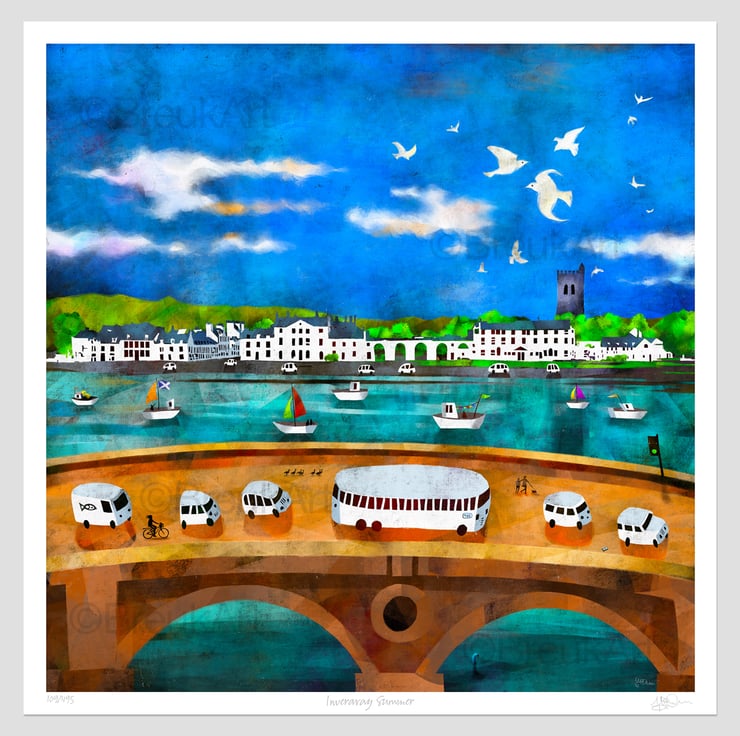 Inveraray is a bustling, vibrant town in summer, and my illustration aims to capture it's colour and life during this season. Whether it's for the food, the pubs, the fishing, or the famous castle, jail or distillery, Inveraray is a picturesque and thriving village on the banks of the rugged west coast of Scotland.