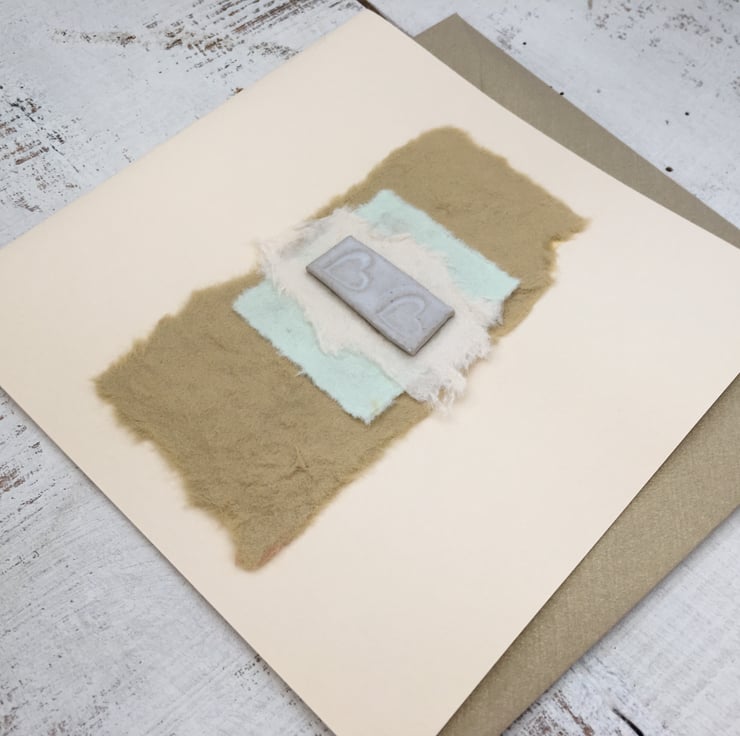 This gift card is perfect to give as a card and gift rolled into one. I have attached a one-off ceramic design to each card so this can be received as a card initially. The piece of pottery can then be either framed or taken off and used as a Love charm.
