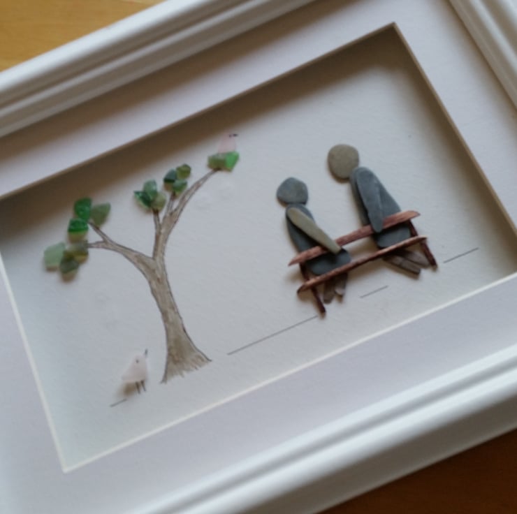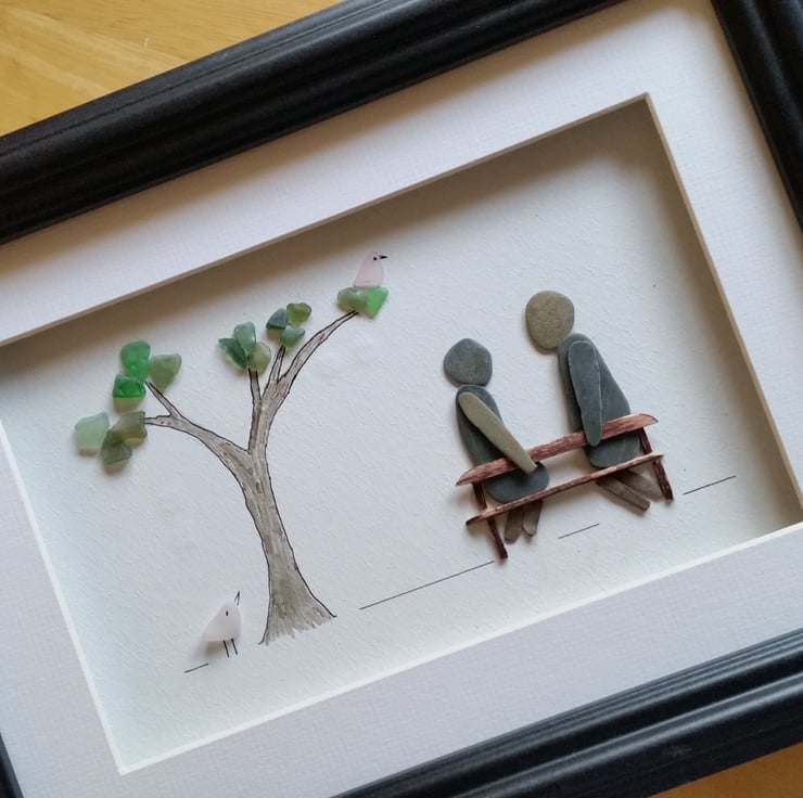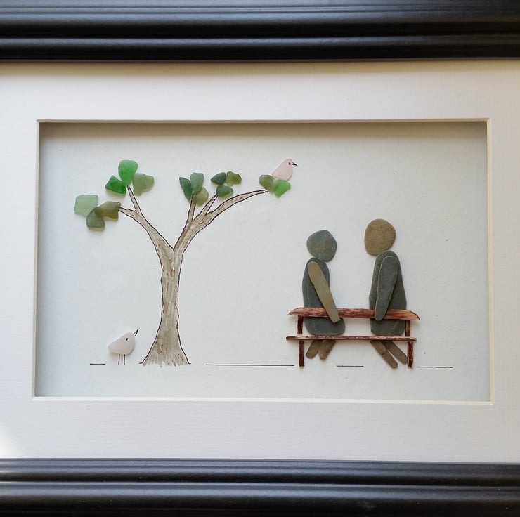 A loving couple sit on a little wooden bench beside a tree with leaves made from sea glass ad featuring two sea glass birds.