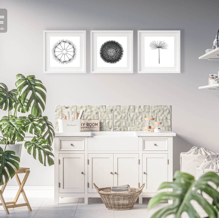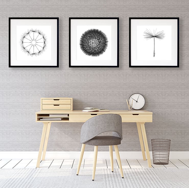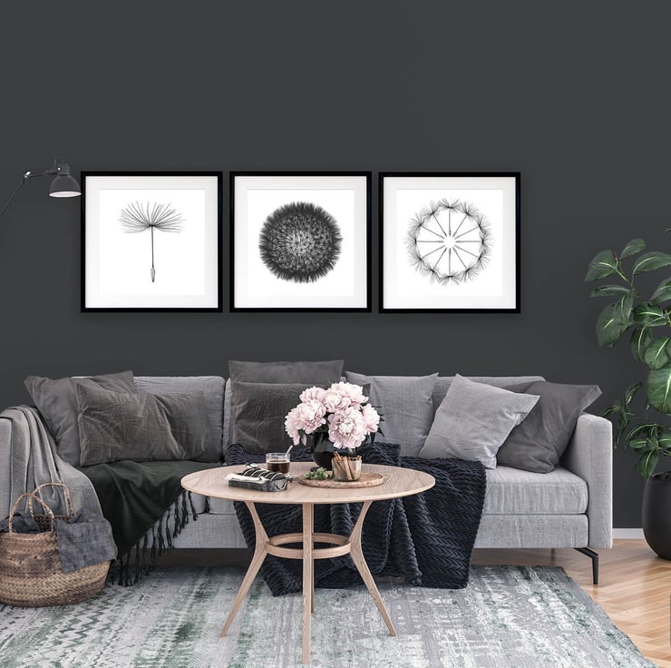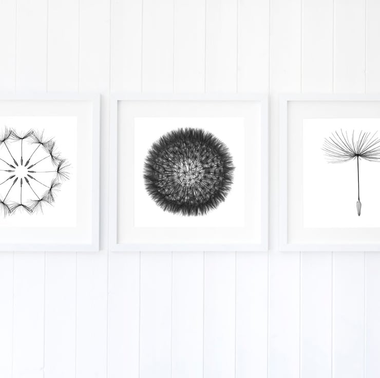 A set of three modern monochrome black and white prints showing deconstructed dandelion clocks. These prints would make a great addition to any modern minimalist décor, including modern apartments and lofts spaces.