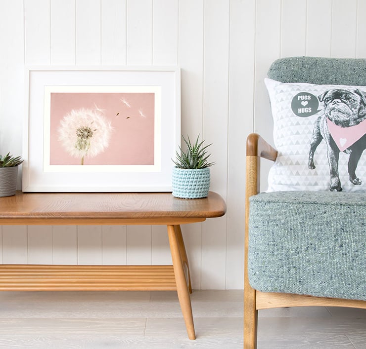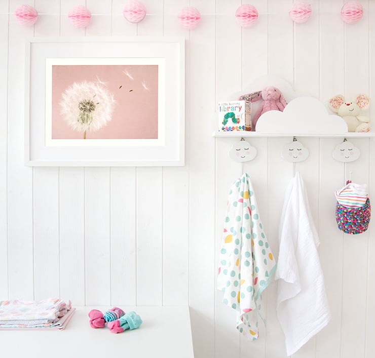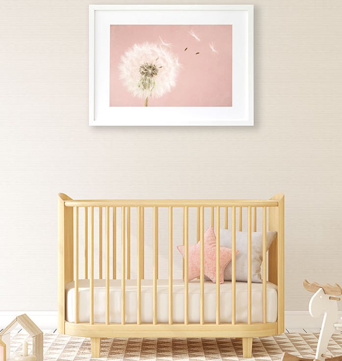 A dreamy botanical print of a dandelion clock in a gentle summer breeze against a textured pink background makes gorgeous pink nursery wall art. This make a wish dandelion clock print would make a lovely addition to any living space, especially a baby girl's nursery art.