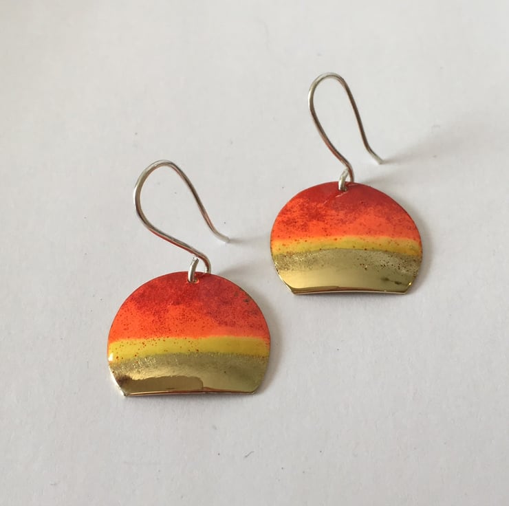 These striking dangly earrings are handmade by Alison, using brass and bright colour enamel, which look like a sunset! They measure about 20mm. All of Alisons handmade jewellery comes in a smart black box.