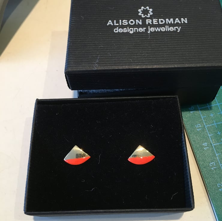 Another lovely geometric shape, or could be nautical shaped stud earring. They are made in brass with a strip of neon orange resin enamel. The fitting on the back are sterling silver and all of Alison's handmade jewellery comes packaged in a smart black box.