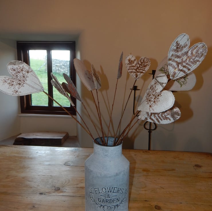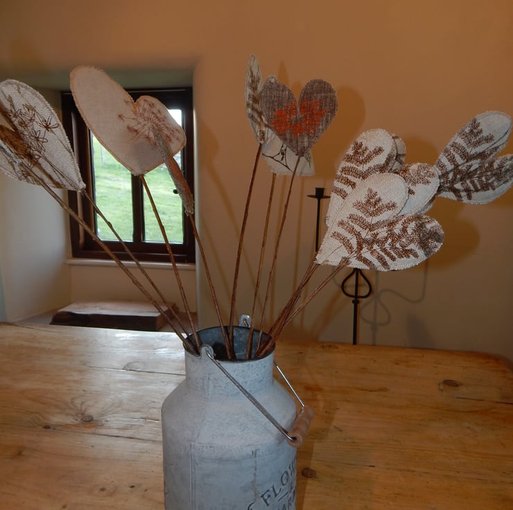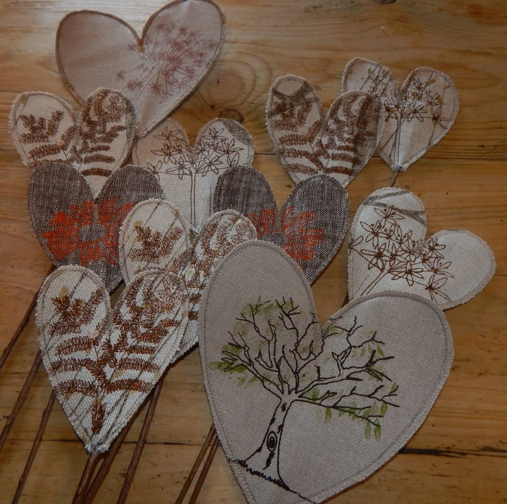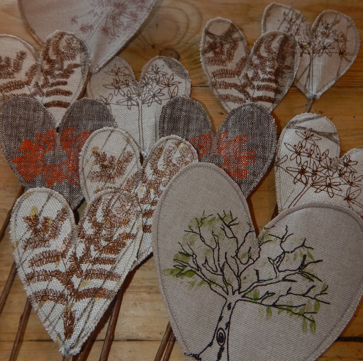 These are 11 screen printed hearts on willow. They are double sided and have bracken, orange daisy, wild garlic, dandelion clock and tree. Each heart has 2 layers of interfacing to stiffen the fabric and the heart has running stitch then a zig zag around the edges to minimise fraying.