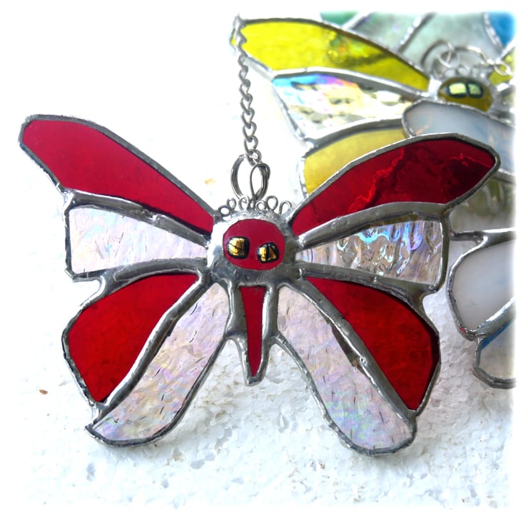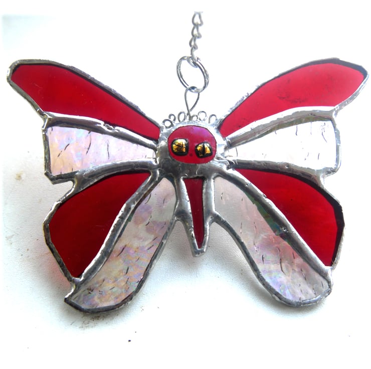 A butterfly made from rich red glass, ruby being the UK birthstone colour for July. The other sections of the butterfly are i textured clear glass to give it extra shimmer.