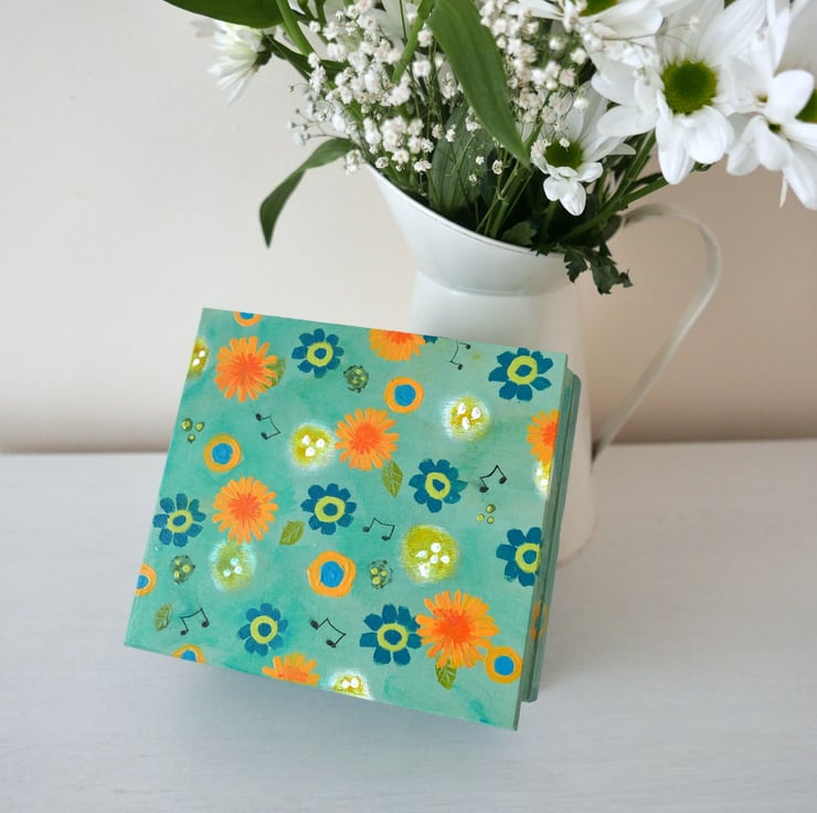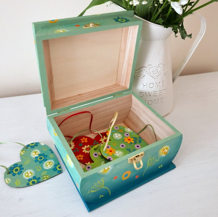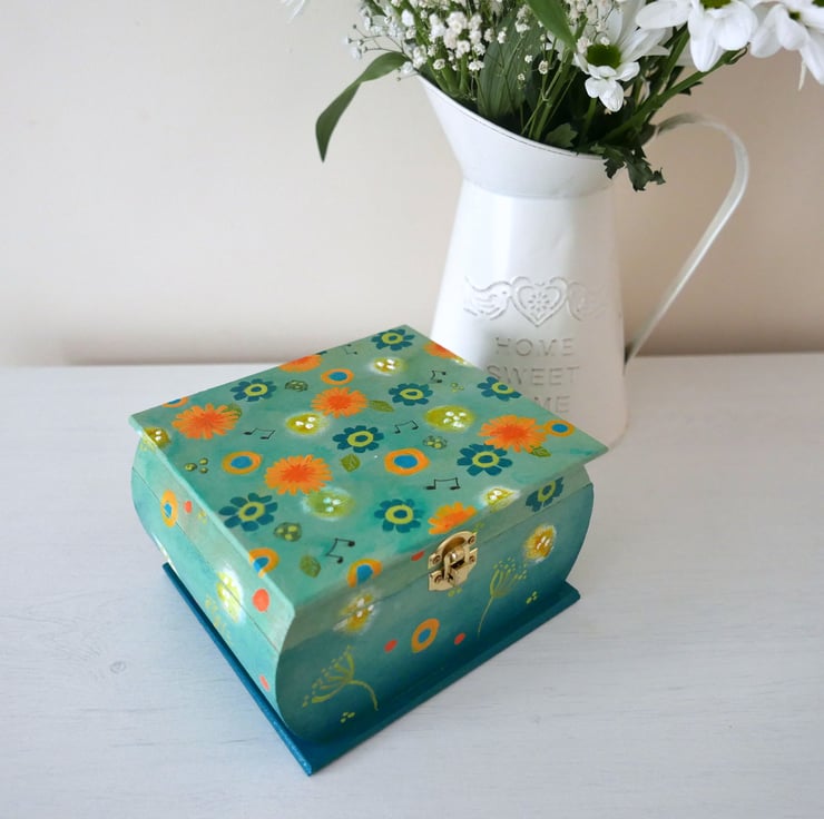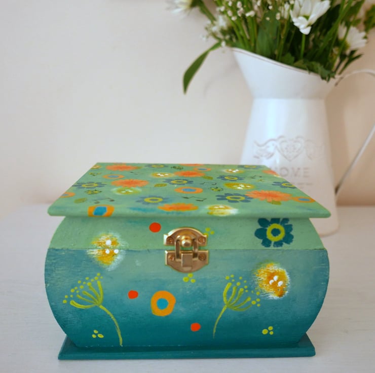 This is a floral hand painted storage box created by me using my usual floral design as seen in some of my paintings and hanging hearts. I used a plain wooden box and I applied acrylic paint in shades of teal, mint and turquoise for the background and dandelions and other flowers in shade of teal, yellow and orange on the foreground. The box is varnished for protection with gloss varnish.