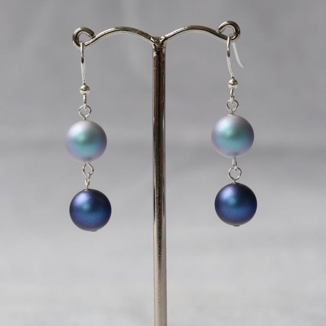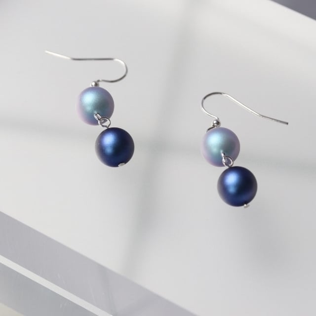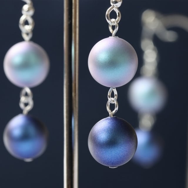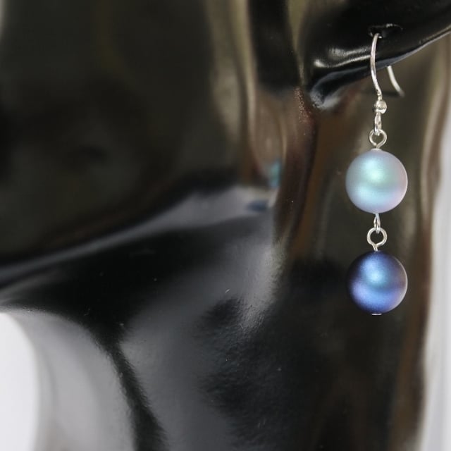 The new iridescent Swarovski crystal pearls have been used in these very summery earrings. Each 10mm crystal pearl has a frosted finish with a slight pink tint when it catches the light. The top faux pearl in each earring is a pretty pale blue and the lower one a darker shade.