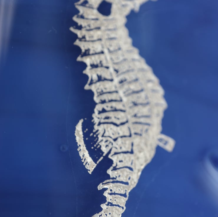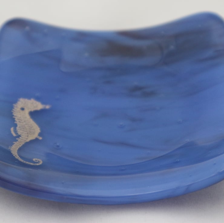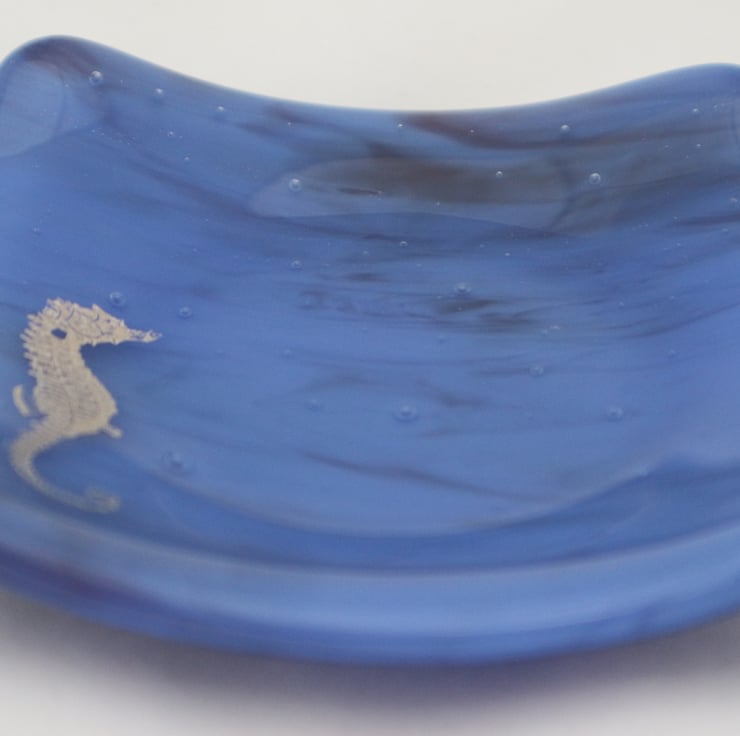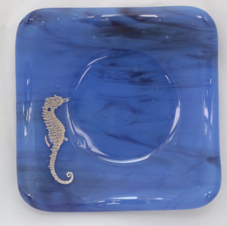 This square trinket bowl has a gorgeous deep Ceylon blue marbled base with a platinum seahorse design and is approximately 10cm across. Please note that this is not a sticker but a real platinum glass decal.Though designed as a trinket bowl, it would make a stunning soap dish. An ideal present for someone you love.