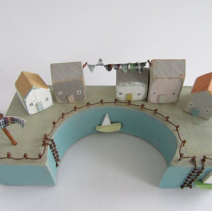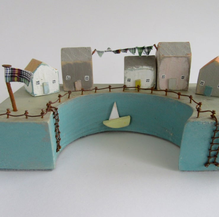 This harbour scene is made using reclaimed wood, rusty wire, paint, varnish and a little flag, bunting and boats. I cut these out on a bandsaw and they can vary in shape, colour and design so if you see one that you might like please let me know when you order and I will endeavour to recreate it as close to this as possible. The fabric might not be the same it all depends what I have in stock.