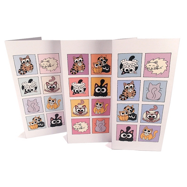 Each card has 8 boxes featuring a variety of cartoon cats, including a curious black cat, a scruffy ginger tom and 3 little kittens. 1 card has boxes in blues, purples and turquoises, 1 card has boxes in pinks, oranges and reds and 1 card has boxes in pastels.