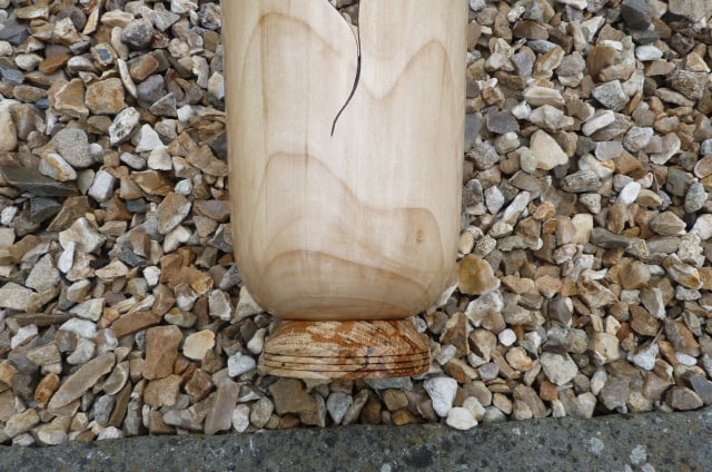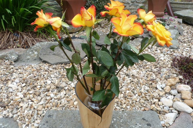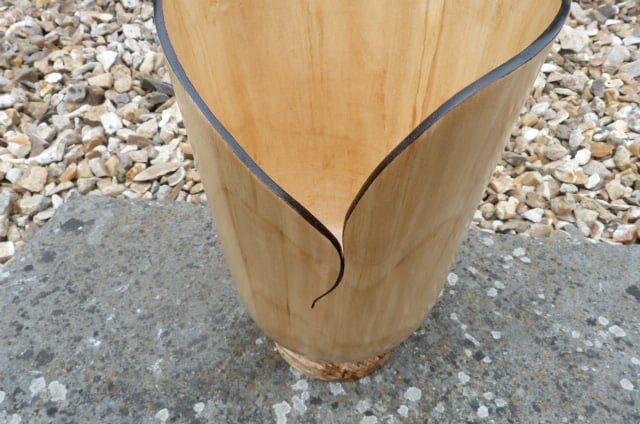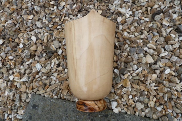 OF SYCAMORE WITH SPALTED BEECH TO THE BASE , THIS PIECE STANDS 11-1/2'', 6-1/2'' WIDE AT THE TOP, THE INTERNAL DEPTH IS 9-1/2''. MADE TO HOLD A GLASS OR CERAMIC WATER CONTAINER FOR THOSE LOVLEY FLOWERS. SHINY FINISH, LOTS OF DANISH OIL.