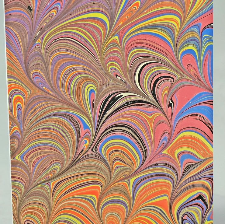The pattern is variant on the bouquet pattern, where only the final stage is the same. Due to the way marbled paper is created, each sheet is unique. Colours may appear differently on your monitor.
