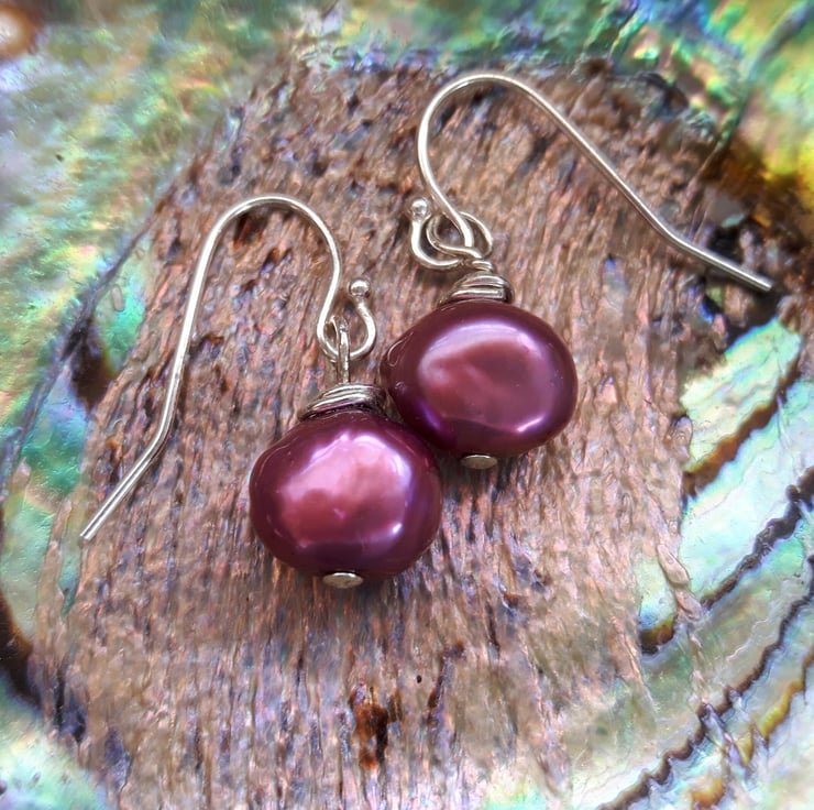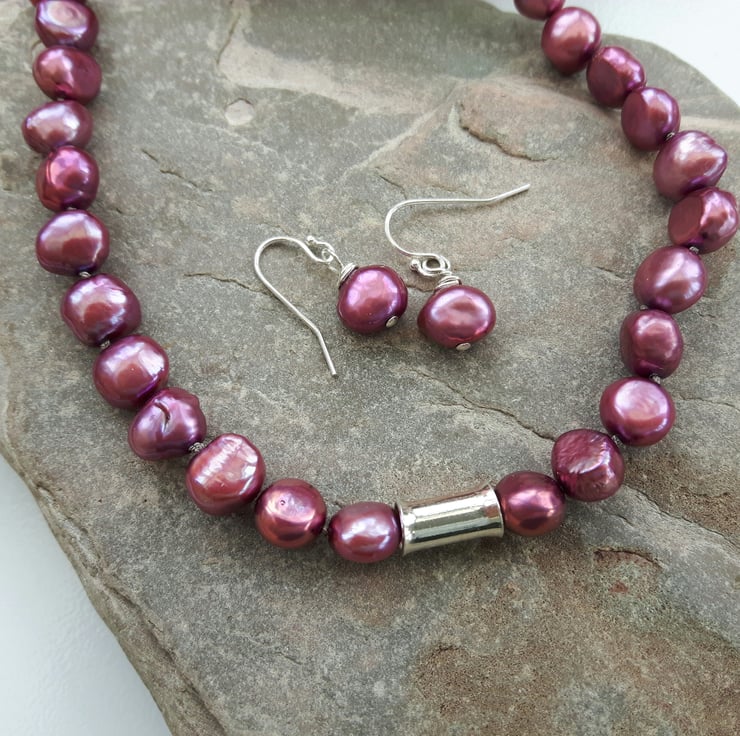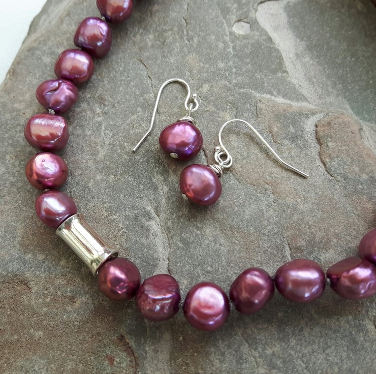 These lovely pearl and silver drop earrings feature freshwater pearls in a dusky pink fuchsia colour. They can be bought on their own or together with a matching pearl necklace - see last two photos. The necklace is available as a separate listing. The pearls are nugget shapes, about 8mm in diameter. They are mounted on sterling silver head pins and wire wrapped at the top. They are very light to wear and dangle from neat sterling silver ear hooks, with a drop of 1.3cm below the hook.