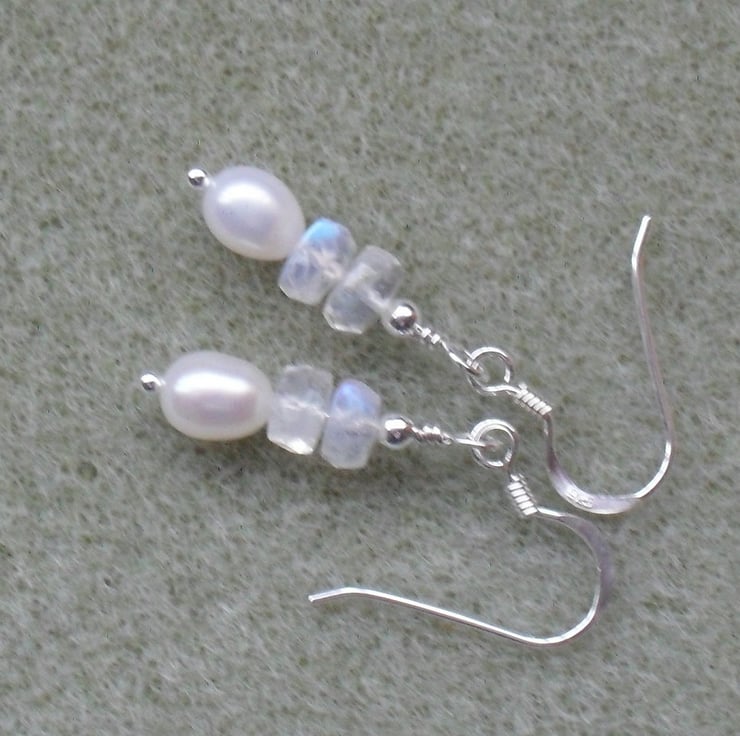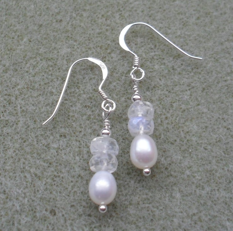 White freshwater pearls with moonstone semi precious gemstones which have blue flashes of colour as the stones move which is difficult to show in the picture, are attached to sterling silver ear wires.