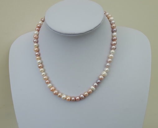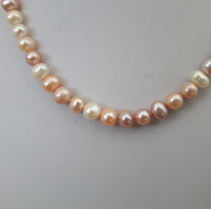 This gorgeous pearl and silver necklace in shades of peach, ivory and pale pink features freshwater pearls with a sterling silver clasp. This is a versatile item that would be ideal as a gift or bridal accessory. The pearls are round to slightly ovoid in shape with a lovely lustre. The average diameter is about 7mm and there are 62 beads in total, knotted by hand onto pink beading silk. The bolt and ring clasp is stamped 925 for sterling.