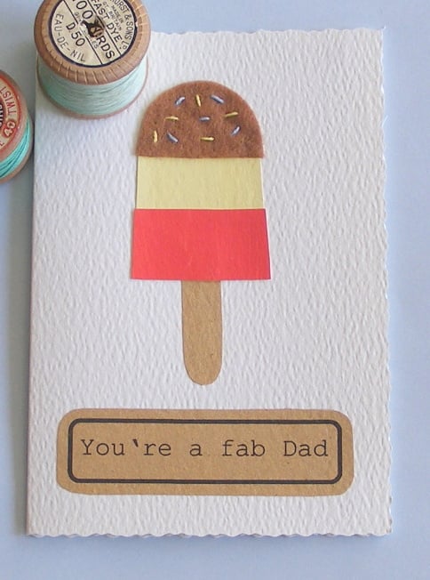 This handmade father's day card has been assembled from hand cut felt, painted paper and recycled paper, The top of the fab lolly is hand cut from felt and is hand embroidered. The middle of the lolly is made from hand cut red and yellow painted paper. The stick is hand cut from recycled paper. The message is printed on to recycled paper.