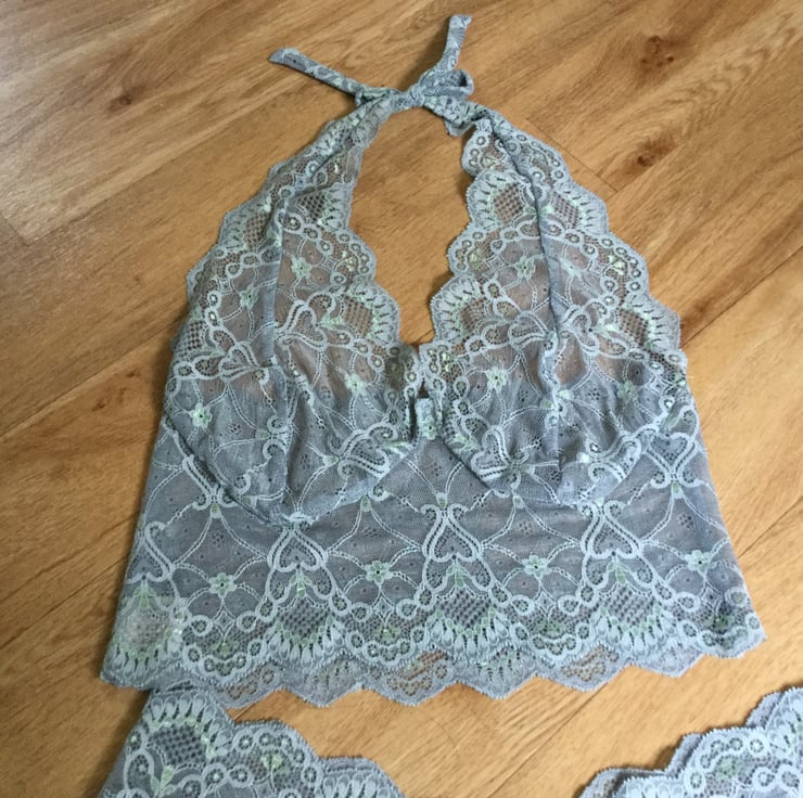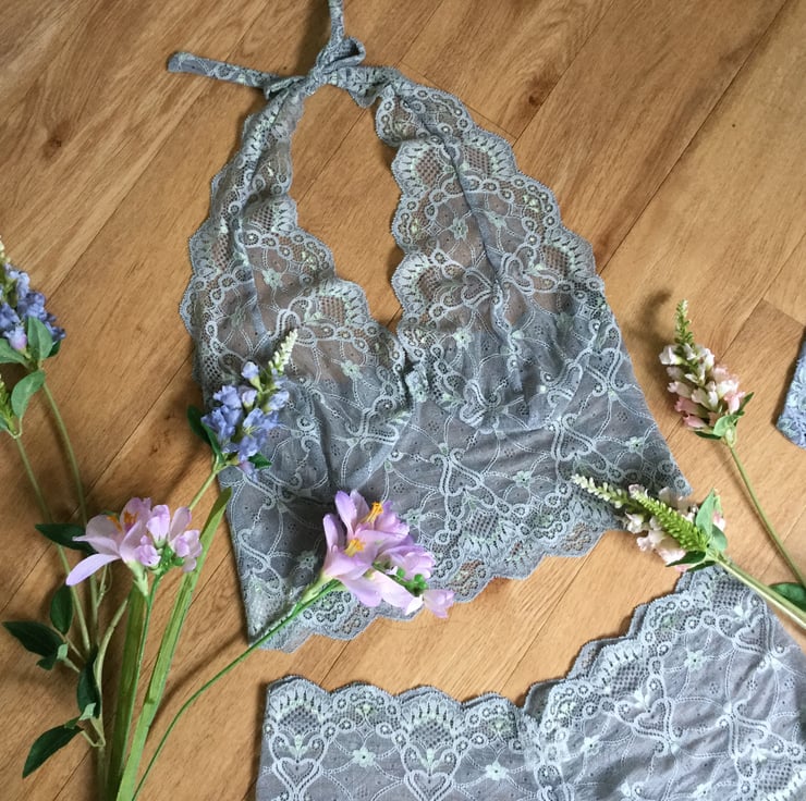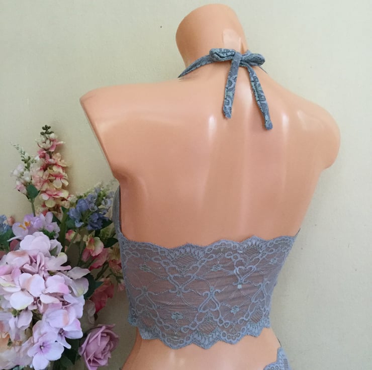 Halter style smokey blue grey Lingerie set , custom made from hand dyed lace.