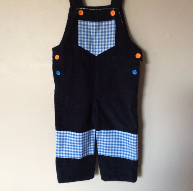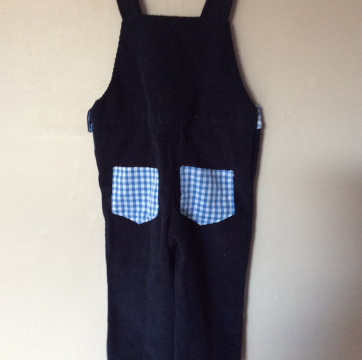 Navy blue corduroy dungarees. Blue check pocket on the bib, 2 on the back and some knee patches. It has nice colourful buttons on the braces and sides for ease of dressing.