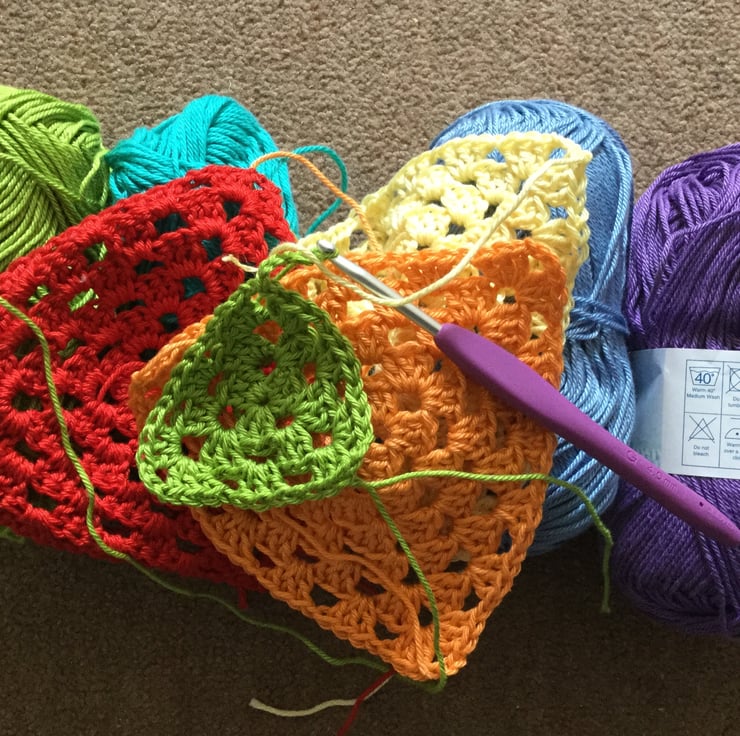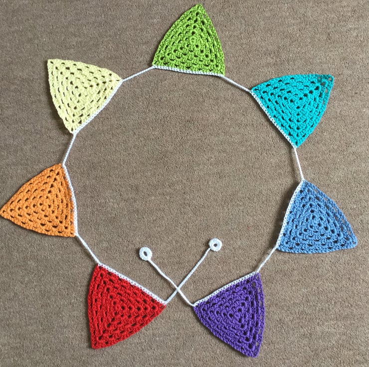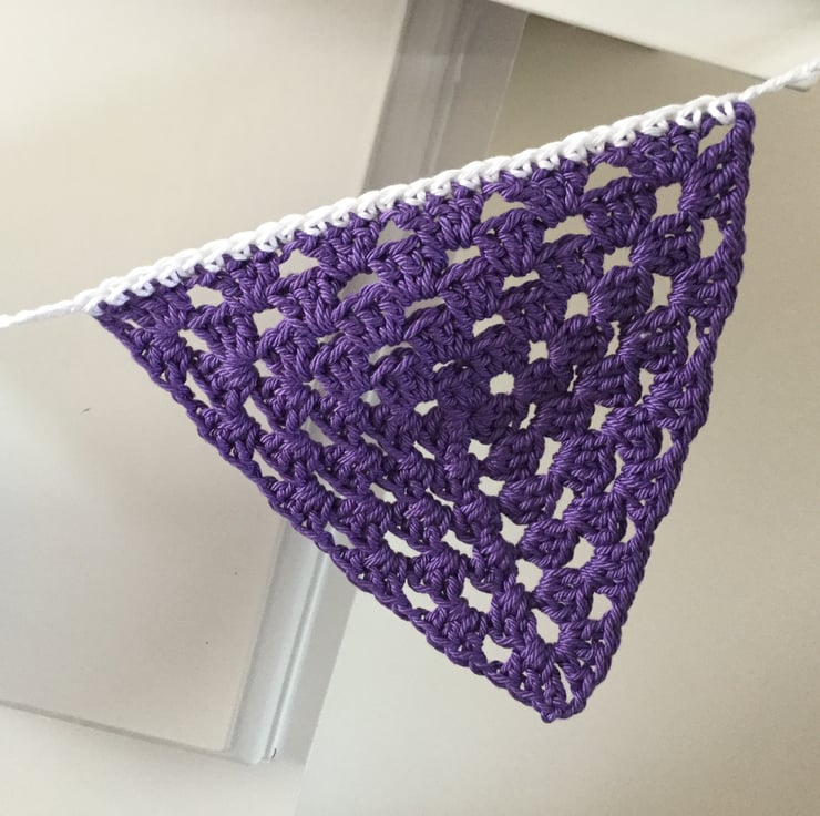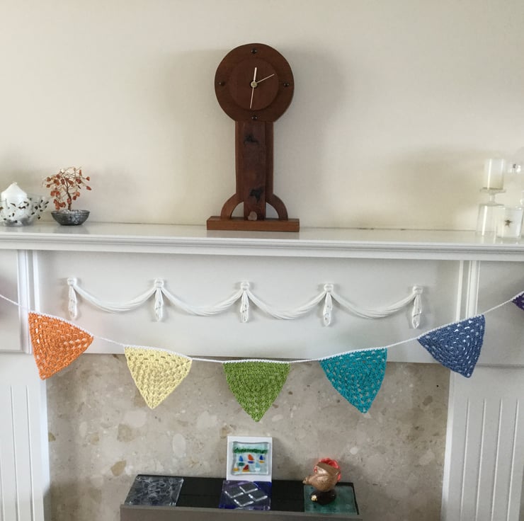 I have crocheted this bunting using a 100% cotton yarn. Each flag is a different colour of the rainbow red,orange,yellow,green,turquoise,blue and purple 7 in total. They are hanging from a white crocheted chain with loops at each end.