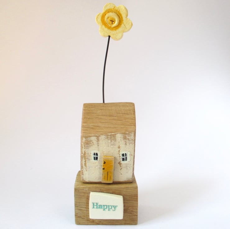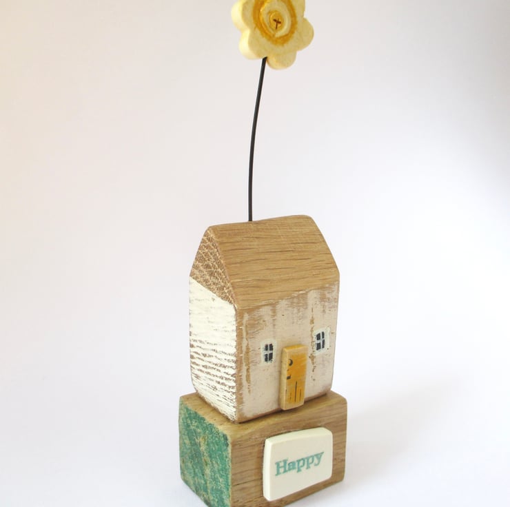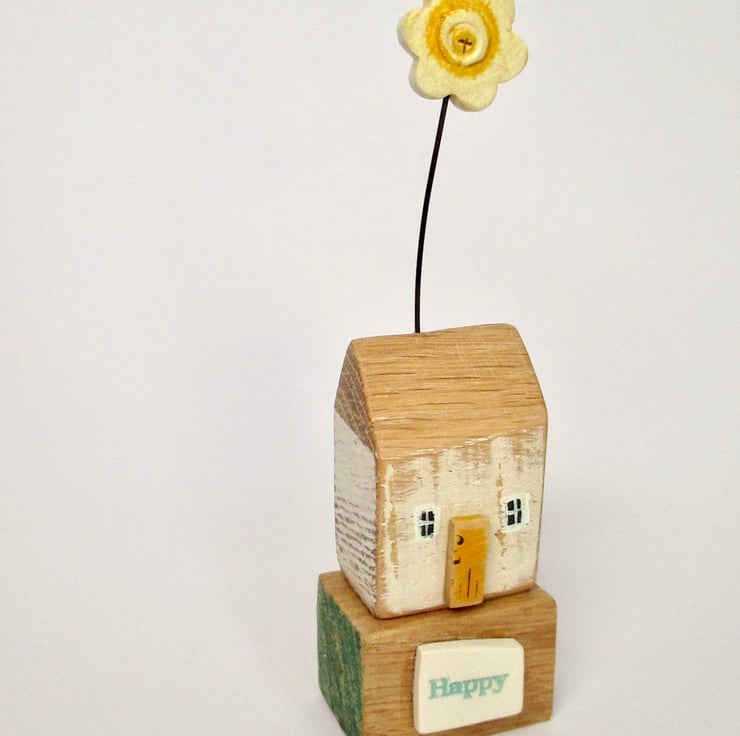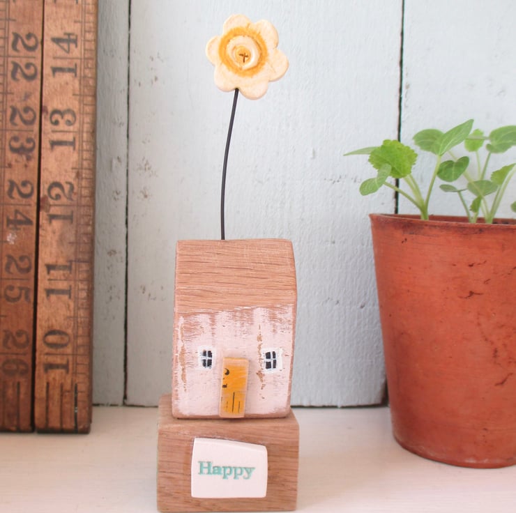 This tiny little oak wood house has been hand carved and painted. There is a little clay flower on the roof for company!