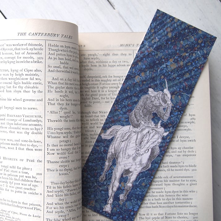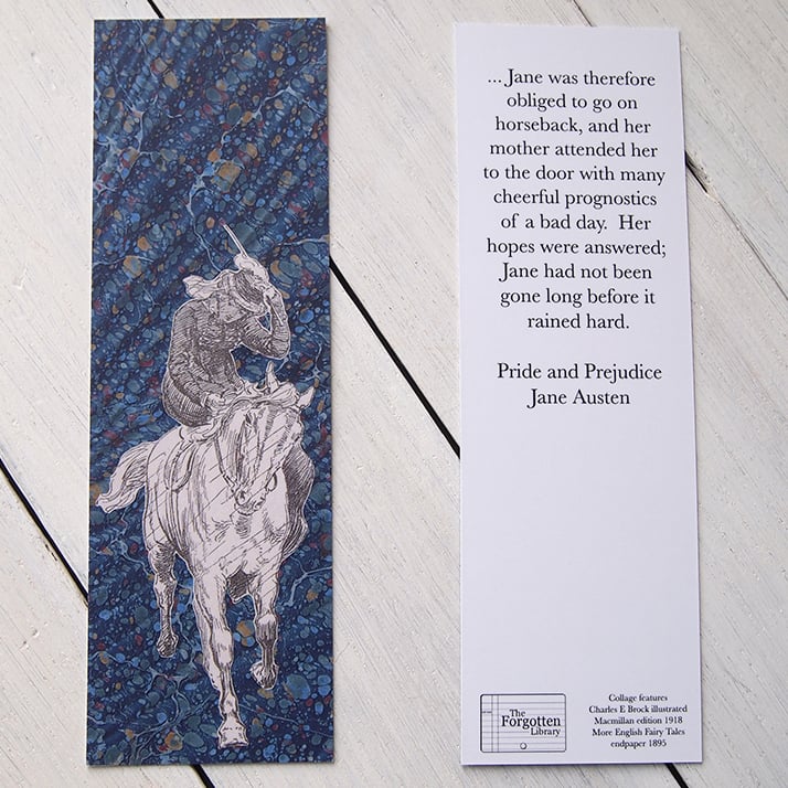 This bookmark design is a collage featuring an illustration by Charles E Brock from a 1918 reprint of the novel Pride and Prejudice by Jane Austen. The background is a beautiful blue marbled endpaper taken from an 1895 book More English Fairy Tales.