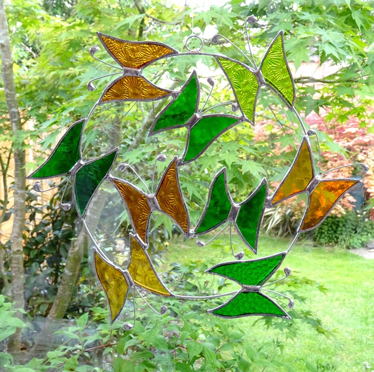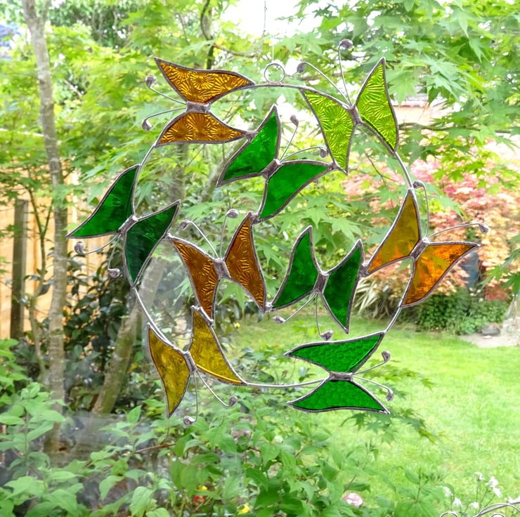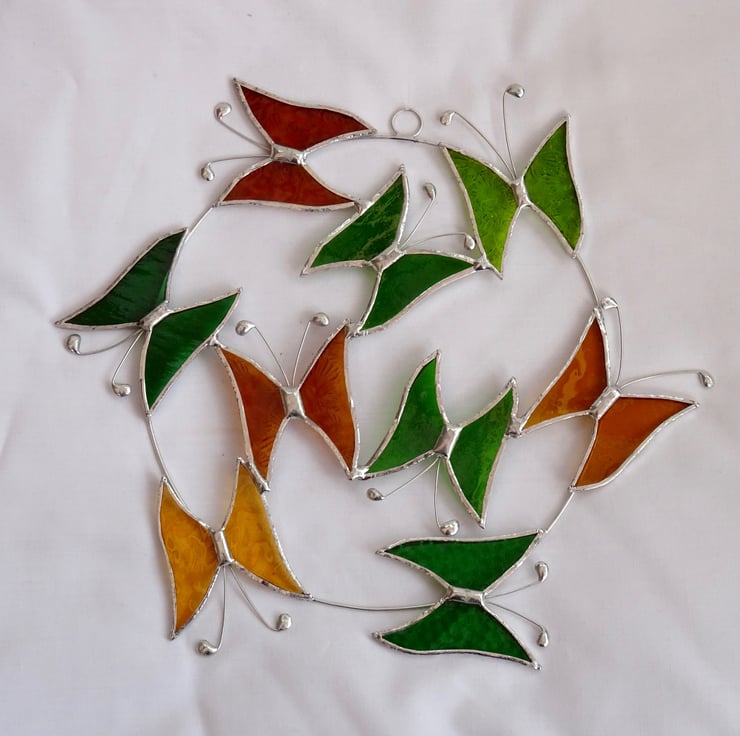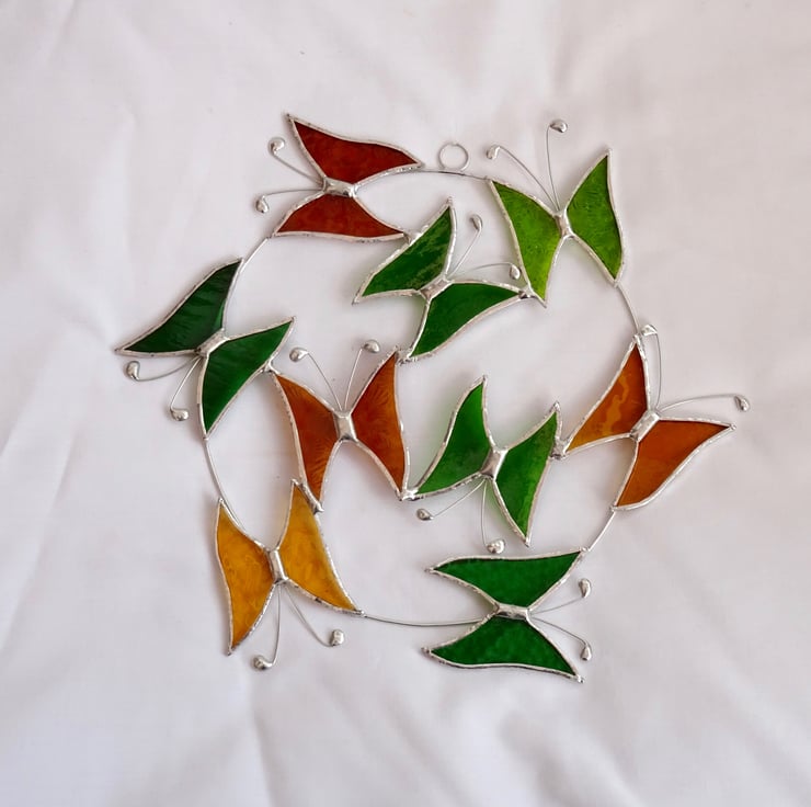 The wire circle is made from tinned copper wire with 6 butterflies attached and a further three in the middle. Each butterfly has been hand cut from beautiful stained glass so it will not fade in the sun, the glass is ground to take off any sharp edges, washed and foiled then tinned before the pieces being soldered together. The antenna are also made from tinned copper wire. A small ring and length of fishing line have been attached for hanging purposes.