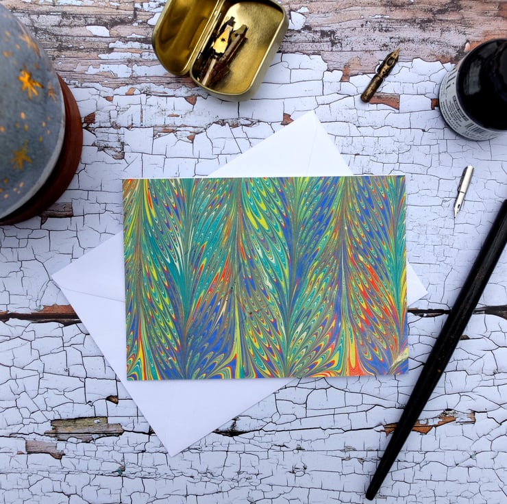 This unique handmade marbled card was made by me in the Lincolnshire wolds and features a feather pattern in ultra marine blue, bright red, bright yellow and pthalo green.