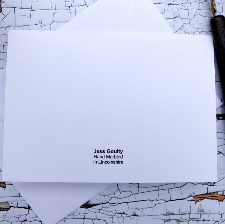 Cut from one of my own unique marbled papers which has then been securely adhered to 250gsm white card stock, the card comes with a matching envelope and in a cellophane bag.