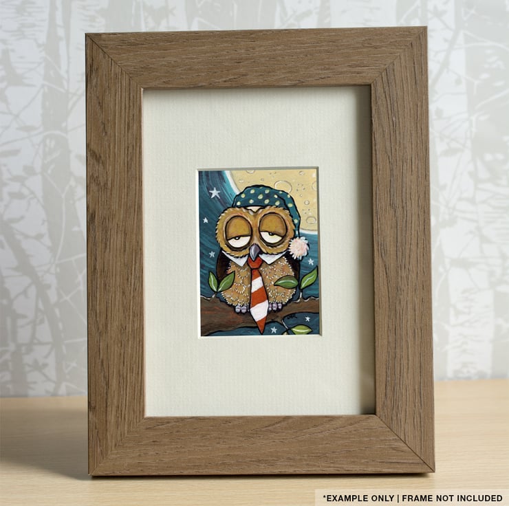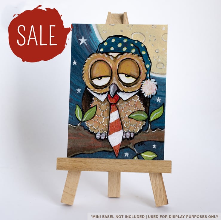 A whimsical owl sitting on a branch in front of the moon. This Business owl is VERY sleepy. He's forgotten to take off his striped tie and shirt collar before putting on his polka dot nightcap!