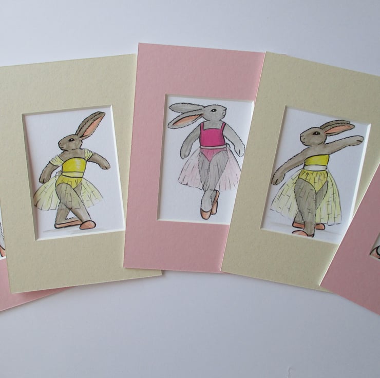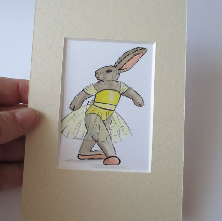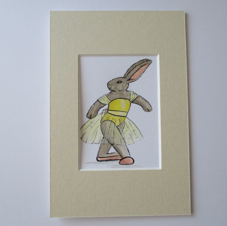 This is an original painting of a ballet dancing bunny rabbit, mounted and ready to frame.
