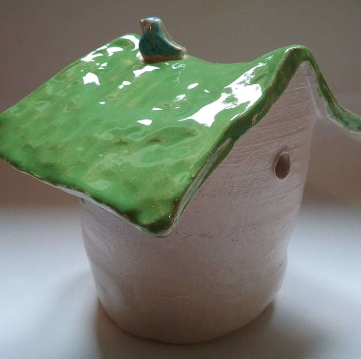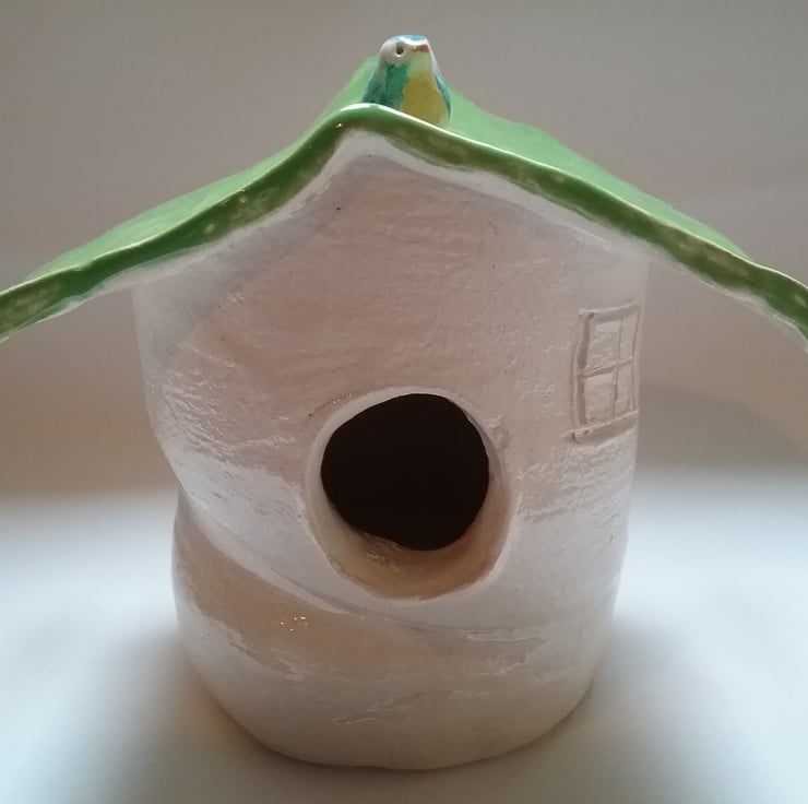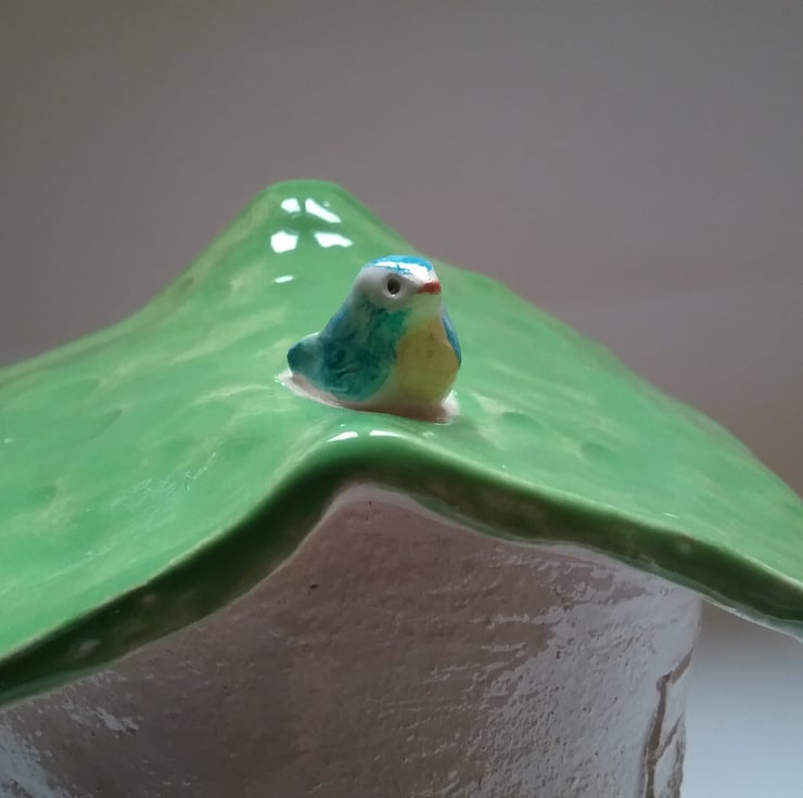 The house was bisque fired, then the little bird was hand-painted, the roof and main body were glazed with a lead-free brush on glaze and then glaze fired to 1100 degrees centigrade.