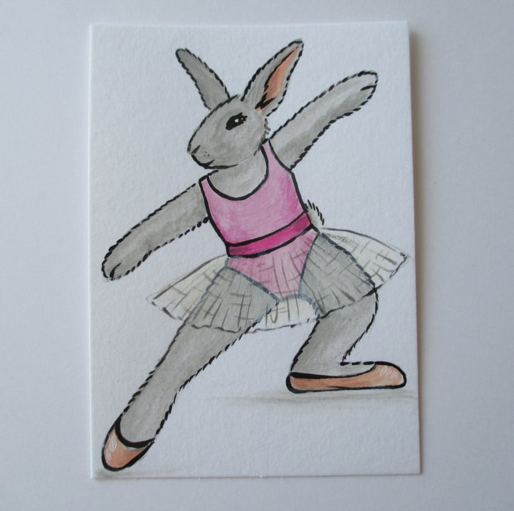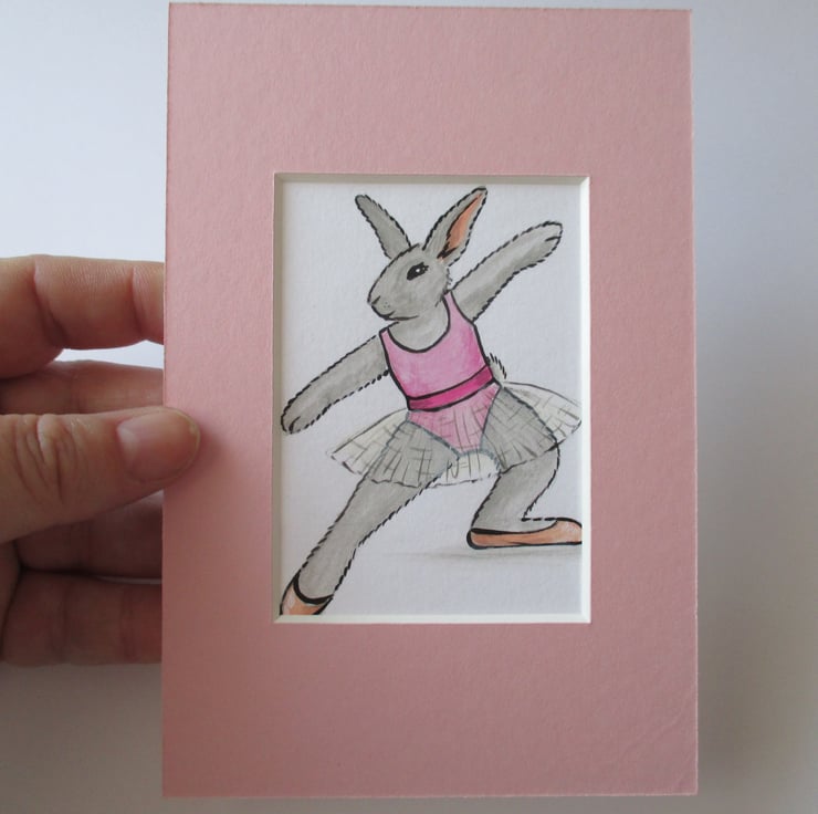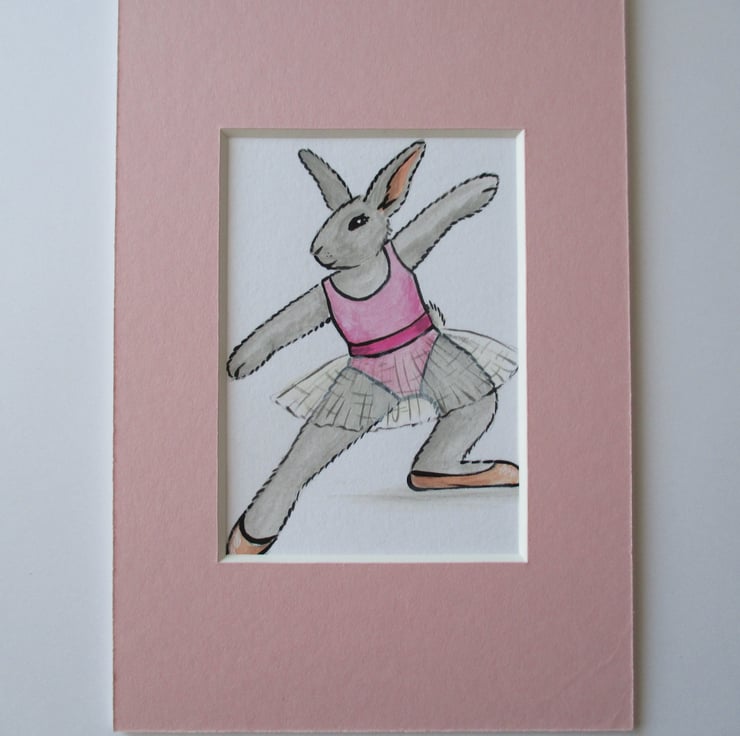 This is an original painting of a ballet dancing bunny rabbit, mounted and ready to frame.