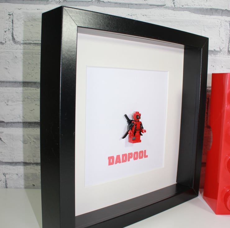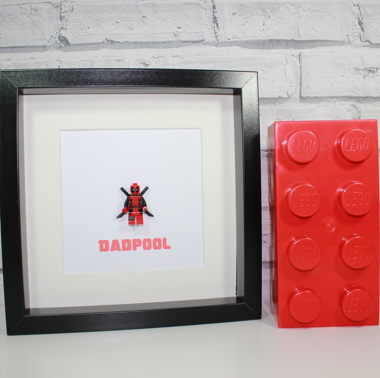 We have mounted a minifigure of the unconventional superhero Deadpool in to a deep box frame (at leasyt behind the glass he isn't going to be able to cause any trouble!). With a quirky play on his name we have framed him with the word "Dadpool" - thus making this particular frame a great gift for any dad who loves Deadpool.