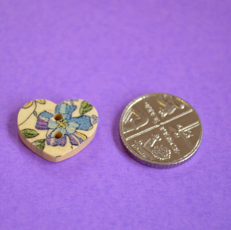 Small Natural Wooden Heart Buttons Floral Blue Purple Green 10pk 18x15mm (NH7)
