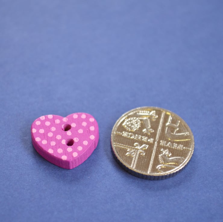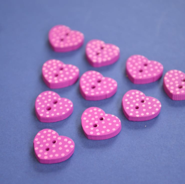 Little Wooden Dotty Heart Buttons Magenta 10pk Spotty Dot Pink 13x15mm (WH6)