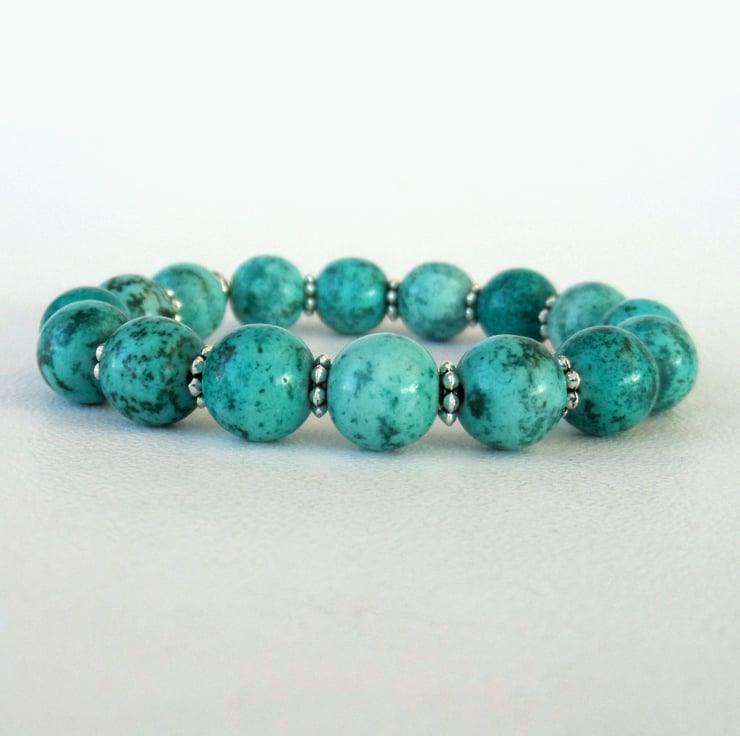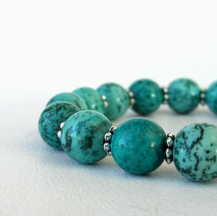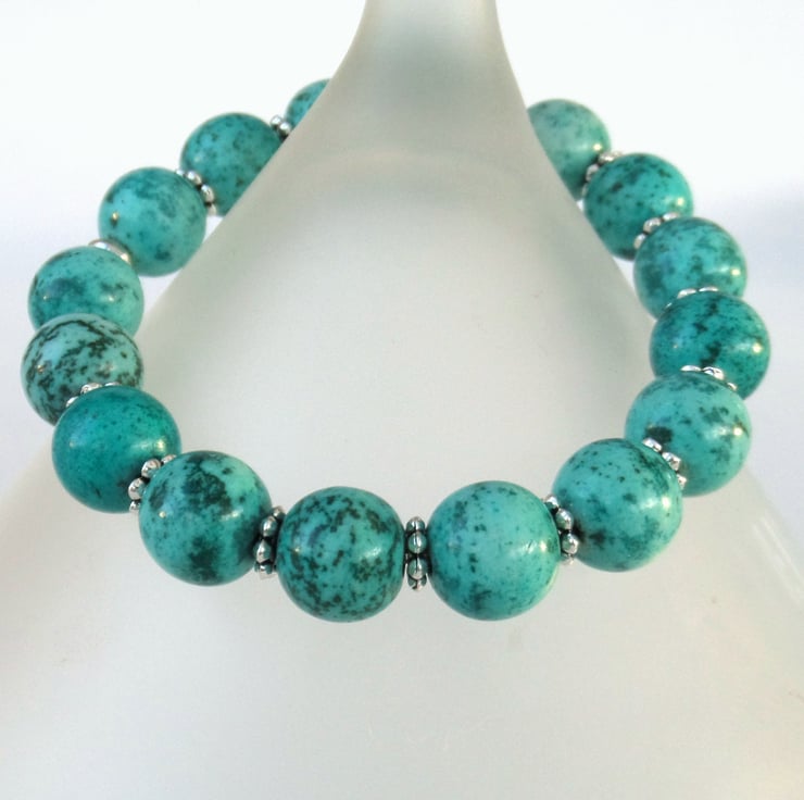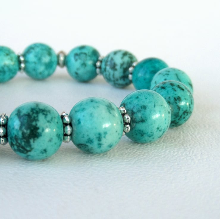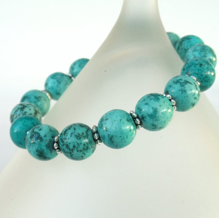 The turquoise beads are separated by narrow little silver coloured beads that highlight the beauty and individuality of the gemstones.